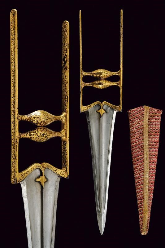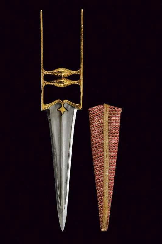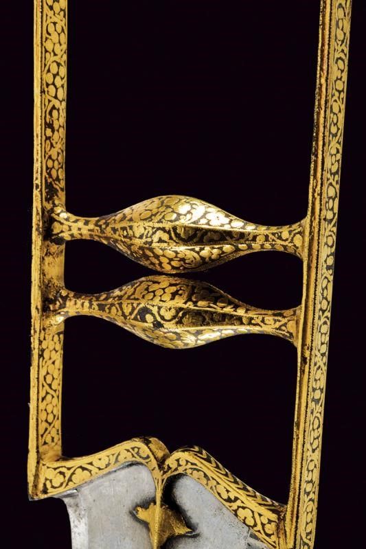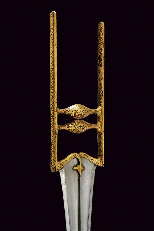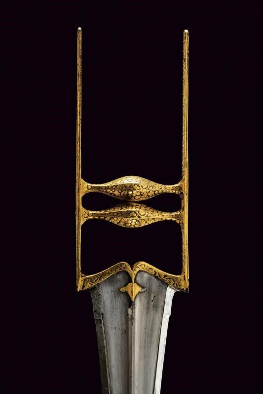 India, lunghezza 44.5 cm. XIX Secolo Lama dritta in damasco a due fili, ingrossata e costolata in punta con nervatura centrale; alla base un decoro a giglio dorato in rilievo. Fornimento in ferro di tipica forma a due barre, decorato con fregi leggermente in rilievo e disegni rimessi in oro koftgari. Impugnatura a due traversini ingrossati e faccettati al centro. Completo di fodero in legno rivestito in panno decorata a motivi geometrici in policromia.