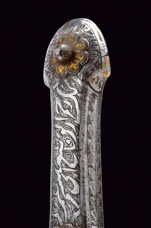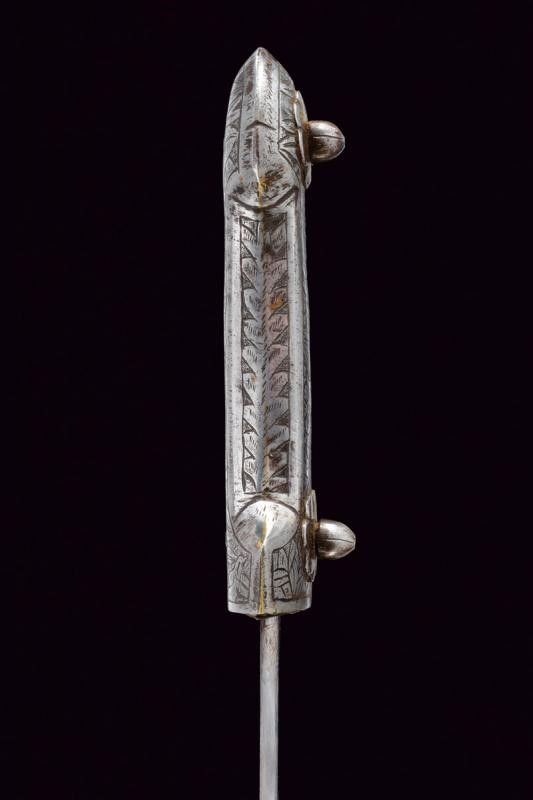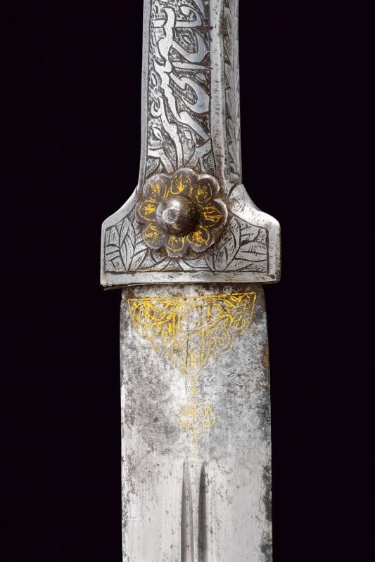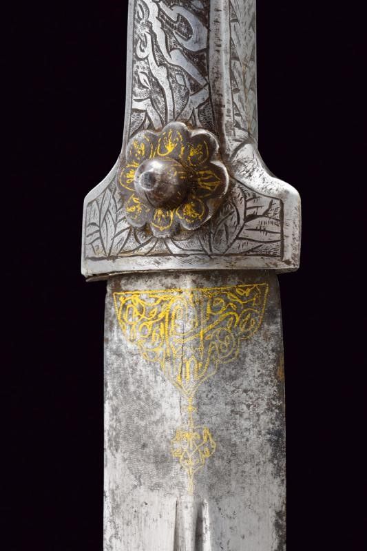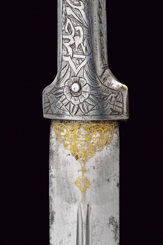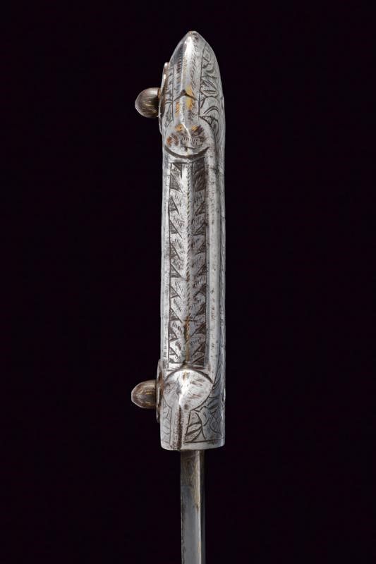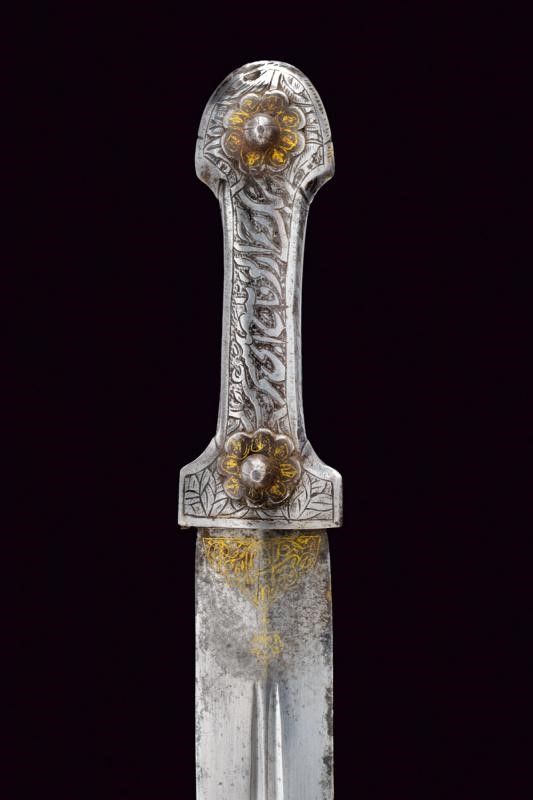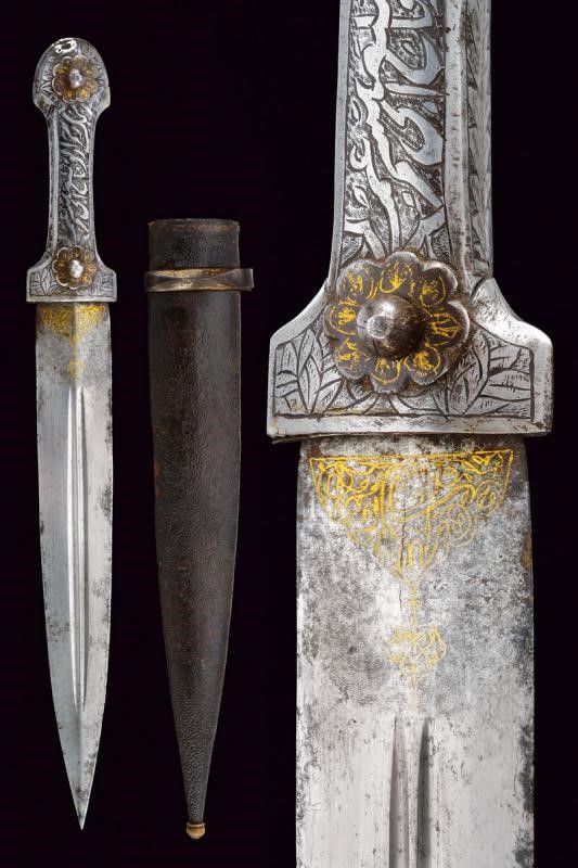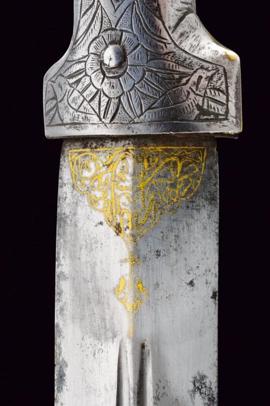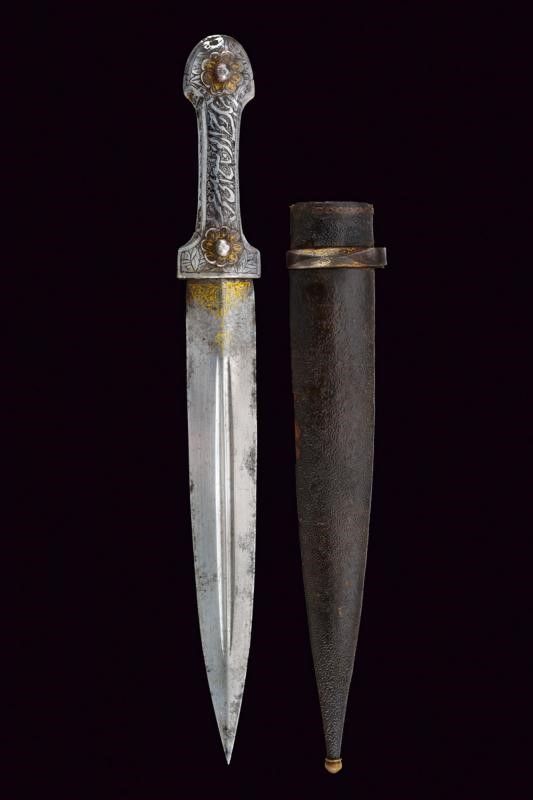 Caucaso, lunghezza 35.5 cm. Fine del XIX Secolo Lama dritta a due fili con duplice scanalatura centrale su entrambi i lati; la base con resti di incisioni floreali rimesse in oro. Impugnatura di forma tipica, in ferro, incisa a motivi floreali e geometrici; rivetti in ferro dotati di base a rosetta con resti di incisioni dorate. Fodero in legno rivestito di cuoio, fascetta con passante in ferro, puntale in corno.