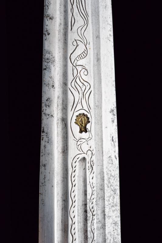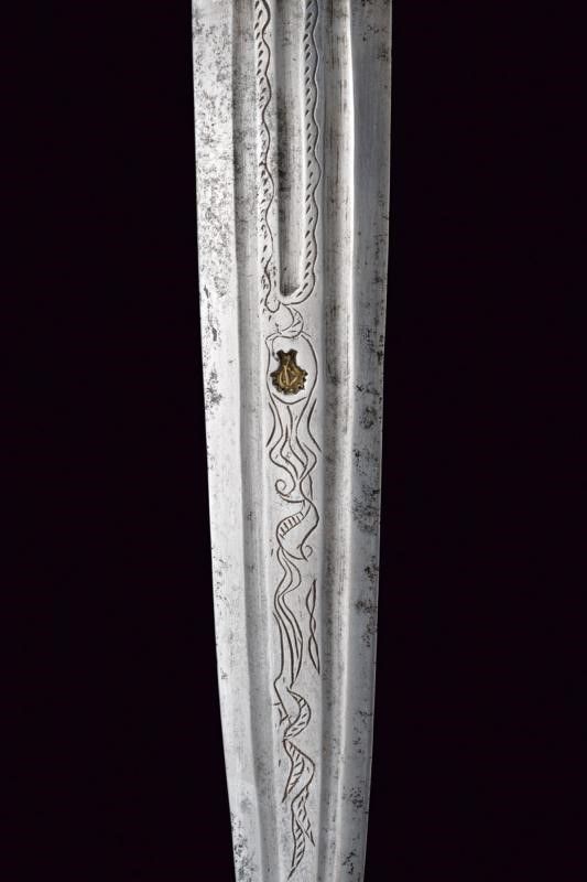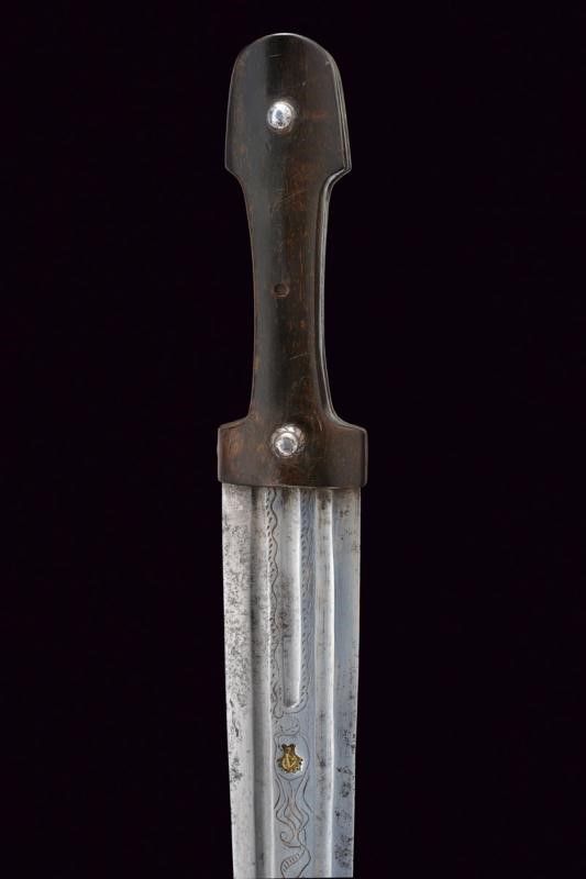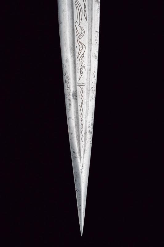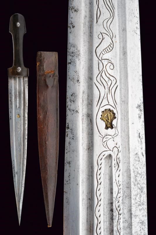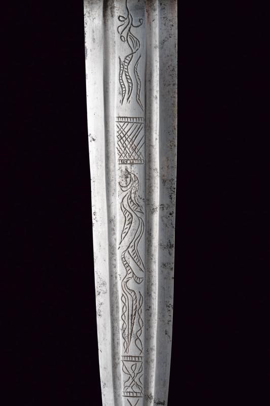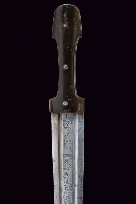 Caucaso, lunghezza 40 cm. Fine del XIX Secolo Lama dritta a due fili con duplice scanalatura, incisa a motivi geometrici e floreali per quasi tutta la lunghezza; in particolare su un lato è presente un punzone rimesso in oro. Impugnatura tipica con guancette in corno dotate di rivetti in ferro (uno mancante). Fodero in legno rivestito di cuoio.