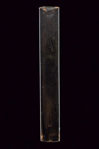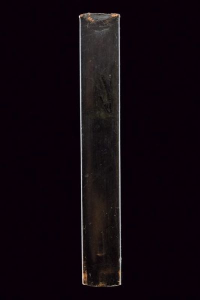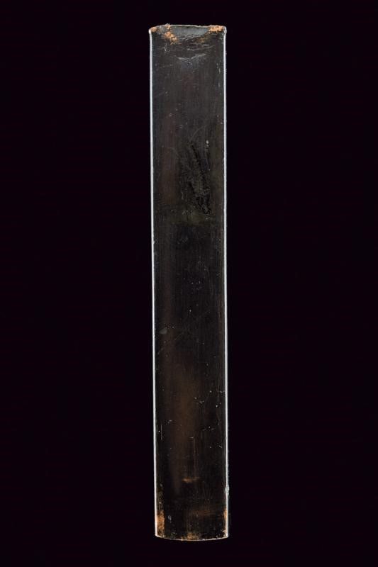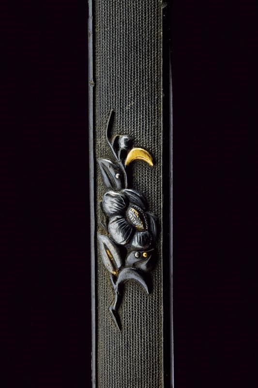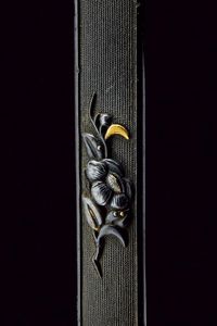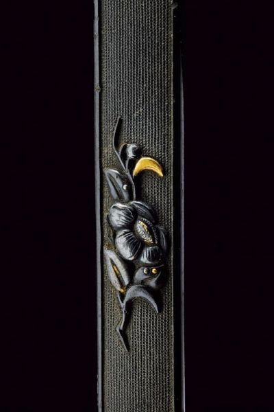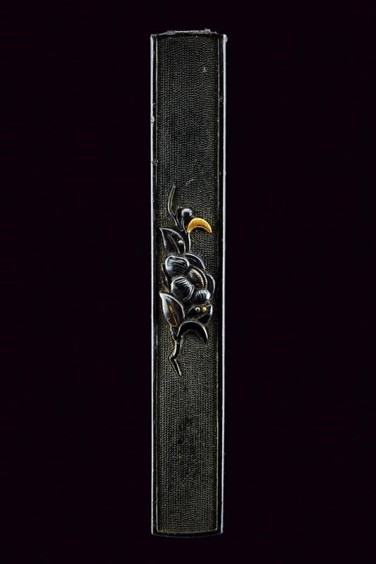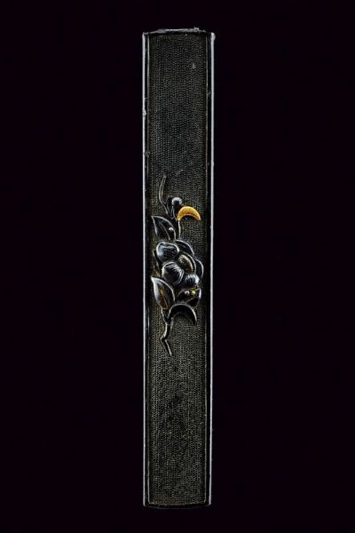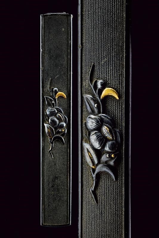 Periodo Edo (1603-1867) In metallo tipo shakudo con decoro Nanako sul lato anteriore. Al centro effige floreale in rilievo con elementi dorati. In Kiri-box.