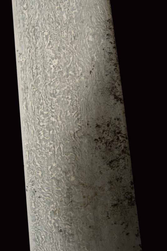 Indopersia, lunghezza 41.5 cm. XVIII Secolo Lunga lama dritta a un filo, in fine damasco, la base con un cartiglio recante iscrizioni in caratteri arabi e con decorazioni floreali, il tutto in oro. Impugnatura in agata, leggermente crescente verso il pomo, che è decorato con un fiore in metallo dorato arricchito da una pietra rossa al centro. Ghiera in rame dorato ed inciso. Fodero in legno rivestito di velluto rosso (parzialmente liso) con due lunghi fornimenti in argento finemente decorati a motivi floreali e geometrici, con resti di doratura. Piccolo anello di sospensione.