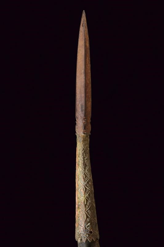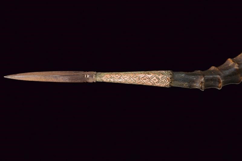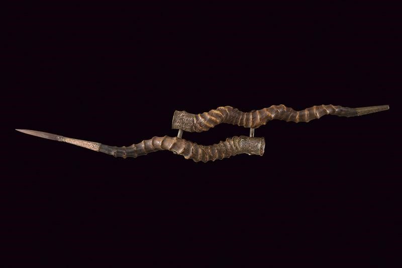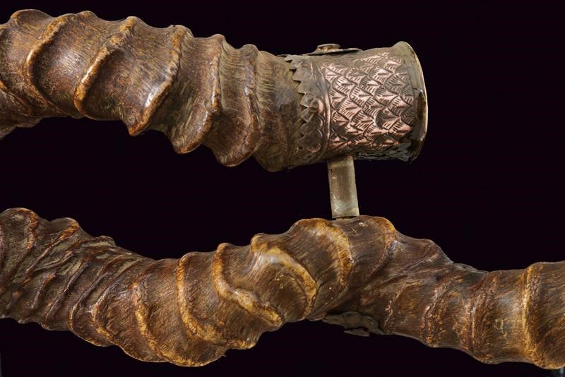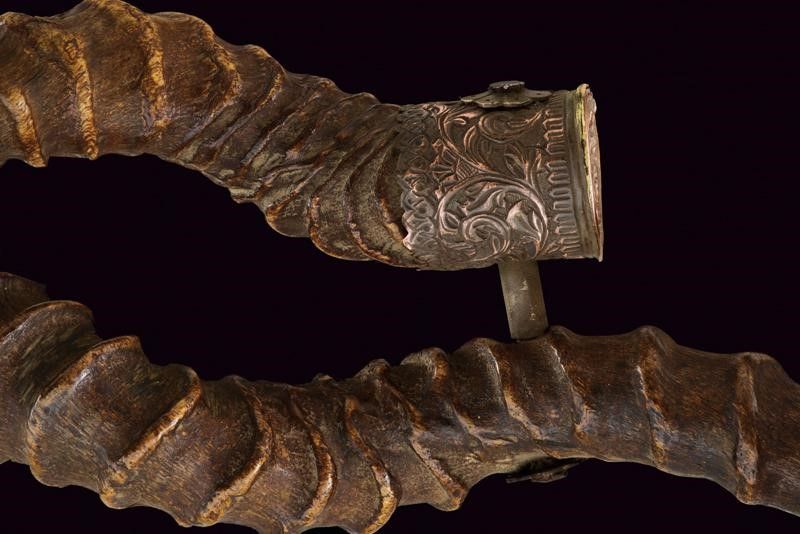 India, lunghezza 43 cm. Inizio del XIX Secolo Costituito da due corna di antilope congiunte insieme da traversini metallici. I fornimenti in lamina di rame, lavorati in rilievo a cornici, petali e racemi. Una delle due corna conserva la cuspide in metallo.