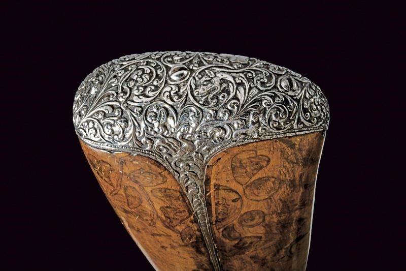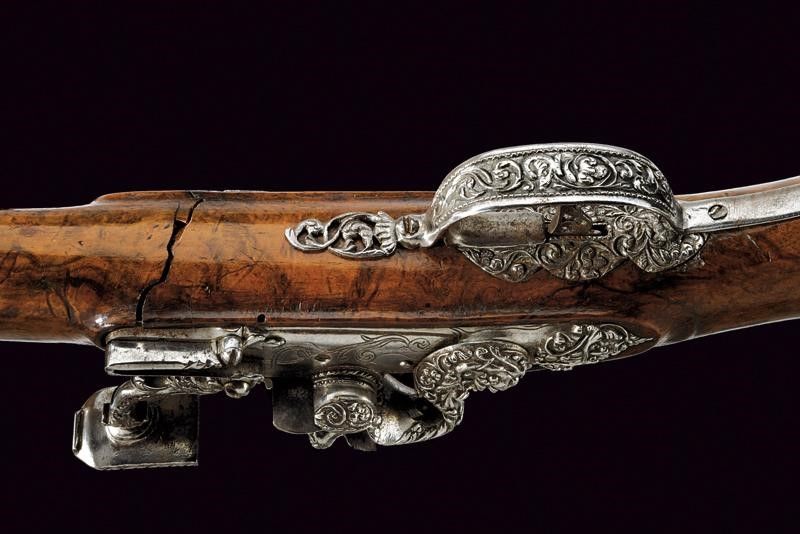Brescia, lunghezza 95 cm. metà del XVII Sec. Canna liscia a due ordini, quadra alla camera di scoppio con duplici delineature ai lati e tonda con tre cornicette scanalate, gioia di bocca in volata e cornicetta scanalata alla codetta. Reca incisa in stampatello tra trifogli la firma Lazarino Cominazzo. Bella batteria con cartella leggermente bombata e incisa con un tralcio, magistralmente intagliata con mascherone e volute terminanti a teste di drago. Cassa intera in radica di noce (fessurata sotto la batteria) e con antico restauro al terminale del fusto. Tutti i fornimenti in ferro intagliati in bassorilevo con maestria nel tipico stile bresciano della metà del seicento. Reca alla contropiastra il gancio da cintura munito di occhio tondo. Bacchetta originale in legno con cavastracci e battipalla in ferro.