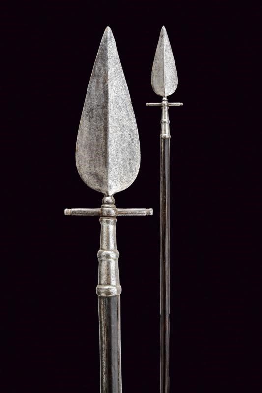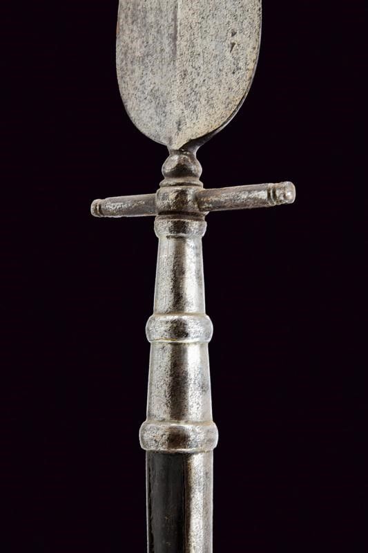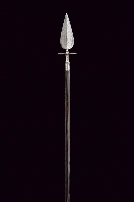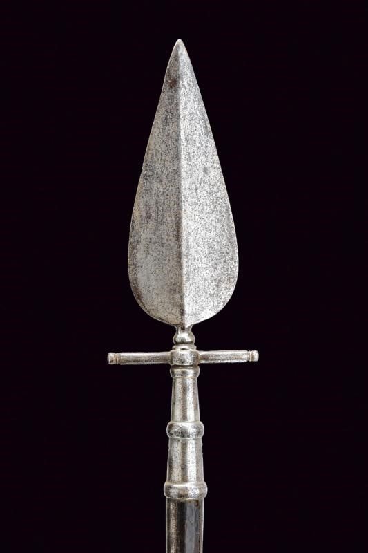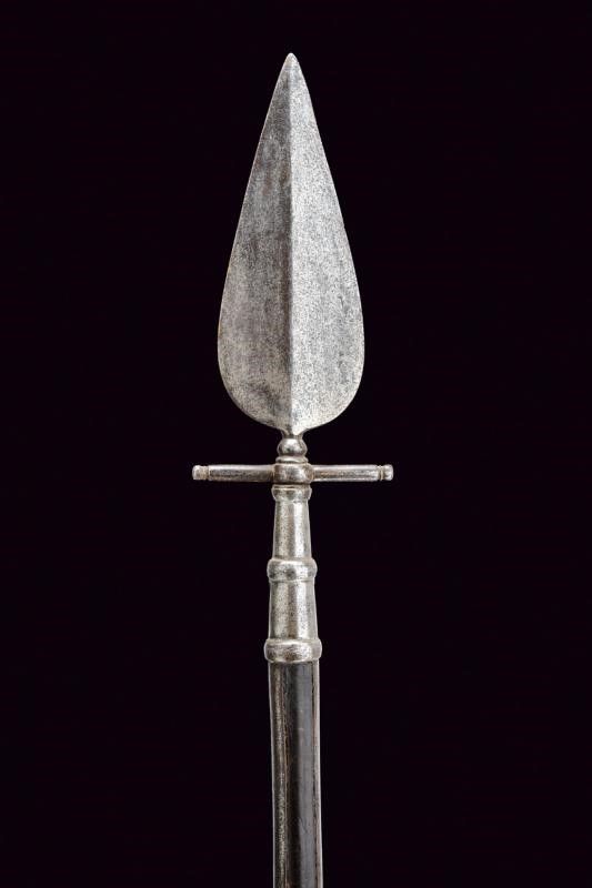 Europa, altezza 205 cm. XVII Secolo Ferro con cuspide a foglia a due fili, costolata in mezzeria, il collo a nodi, dotato di due arresti cilindrici. Gorbia troncoconica con anellature, lunghe bandelle in ferro. Su asta lignea (più tarda?) giuntata al centro.