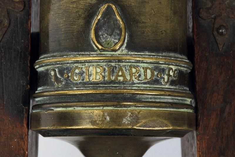 Francia, lunghezza total with carriage 66,5 cm. 1800 circa Canna troncoconica in bronzo con gioia di bocca, dotata di maniglioni lavorati a pesce, orecchioni cilindrici, al dorso emblema araldico coronato sormontato dalle lettere CUR / NON, ben realizzato in rilievo. Il focone in una coppetta ribassata. Alla culatta l'iscrizione GIBIARD Fc.. Affusto ligneo mobile con ruote raggiate e fornimenti in ferro.