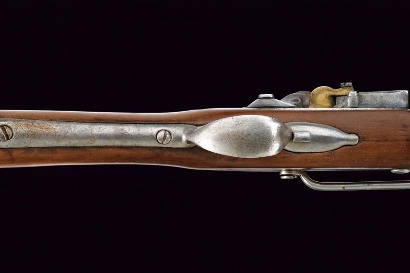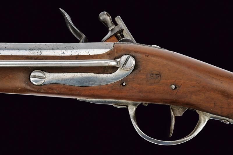 Europa, lunghezza 100,5 cm. Fine XVIII inizio XIX Secolo Canna tonda liscia con culatta ottagonale, con intaccature pulite, in volata cal. 18 mm. Batteria con cartella piatta a codetta tondeggiante, scodellino in ottone, marcatura DV. Meccanica ben funzionante. Mezza cassa in legno con piccoli restauri e resti di timbri quali RF accanto alla contropiastra. Fornimenti in ferro. Il bocchino dotato di mirino. Completo di barra per l'anello da sella in ferro. Bacchetta in ferro. Sul tipo del moschettone francese da Granatieri a Cavallo.
