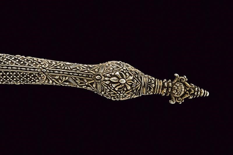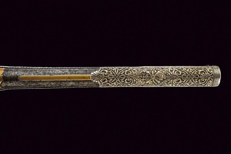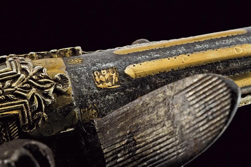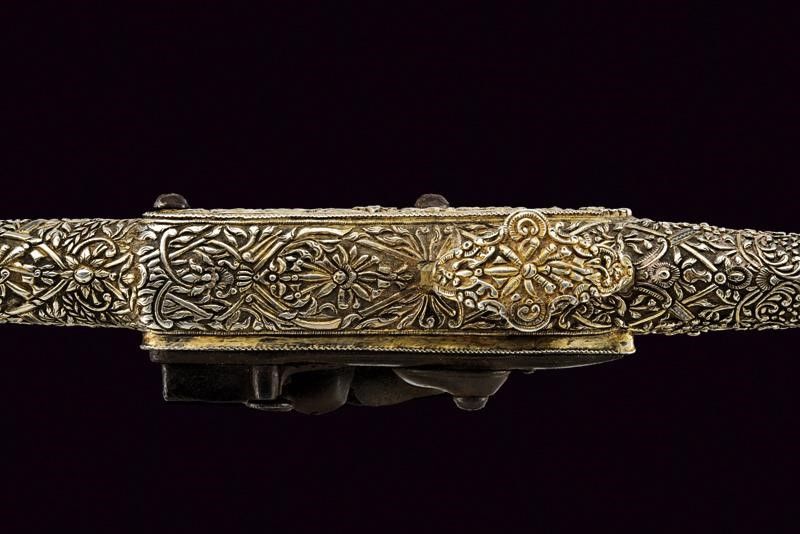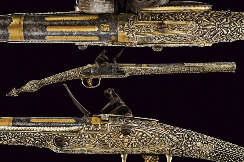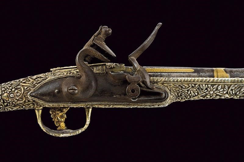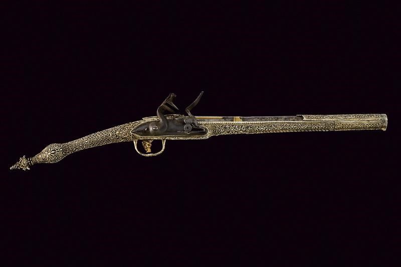 Grecia, lunghezza 60 cm. fine del XVIII Sec. Canna liscia a due ordini, prima ottagonale poi tonda; munita alla base di due punzoni fra i quali uno con le lettere DP sotto corona. In seguito decorazioni in ottone, la volata cal. 16 mm. Codetta rivestita con un fornimento in argento inciso a motivi floreali (crepa). Batteria a pietra focaia, annerita, con cartella tondeggiante. Cassa intera in argento con ricchissime decorazioni in bassorilievo a trofei, conchiglie, motivi floreali e geometrici. Lungo e stretto pomo con grande bottone. Ponticello e reggicanna decorati en suite e grilletto con figura stilizzata e traforata. Finta bacchetta decorata a fingere il tortiglione. Resti di doratura.