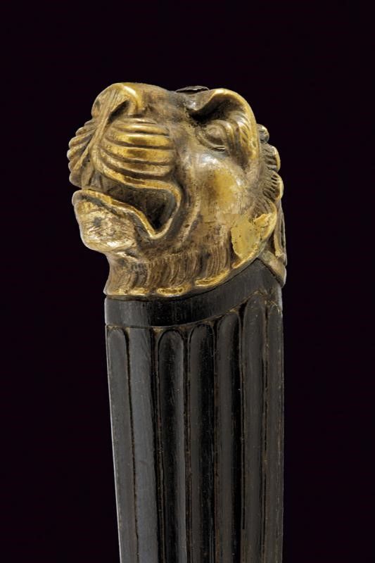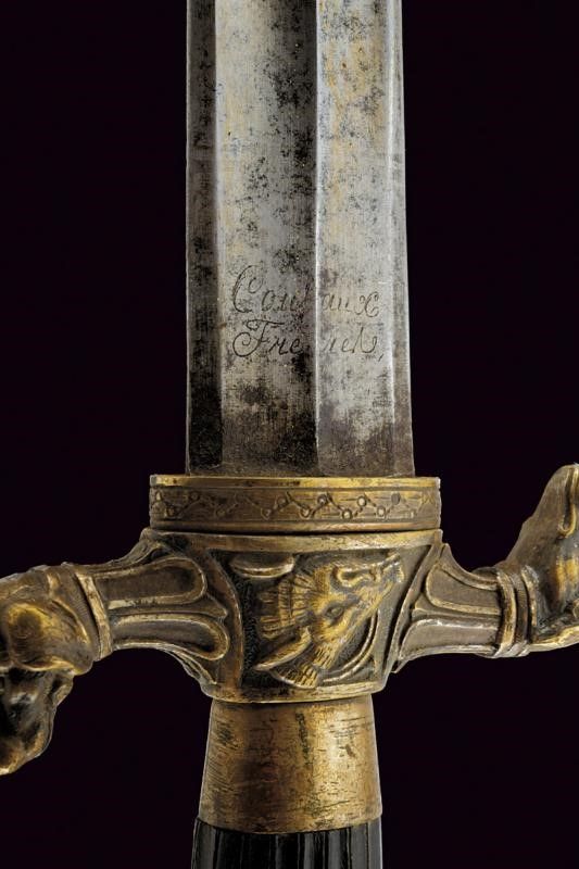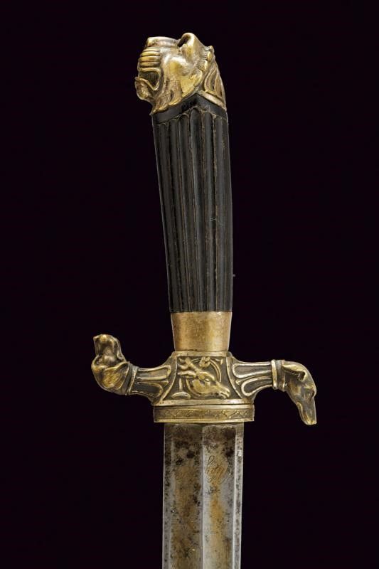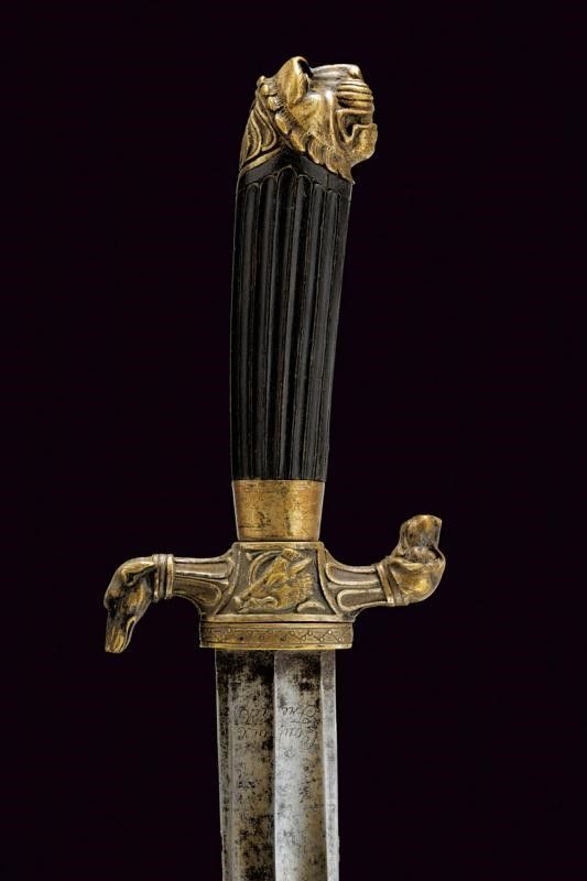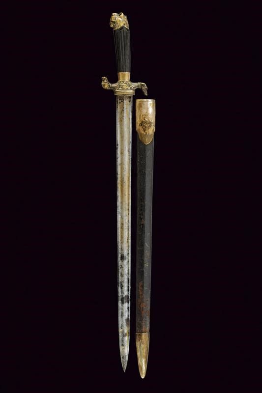 Klingenthal, lunghezza 73 cm. primo quarto del XIX Sec. Lama dritta a due fili con duplice sguscio e resti di incisioni; la base marcata Coulaux Freres Klingenthal. Fornimento in ottone argentato, elso a S con bracci terminanti in teste di segugio, il massello con testa di cinghiale. Grande pomo a testa di leone. Impugnatura in ebano scanalato. Completo di fodero in legno rivestito di cuoio con fornimenti in ottone argentato, il bottone a testa di cinghiale.