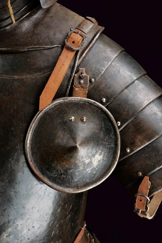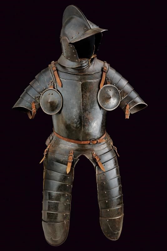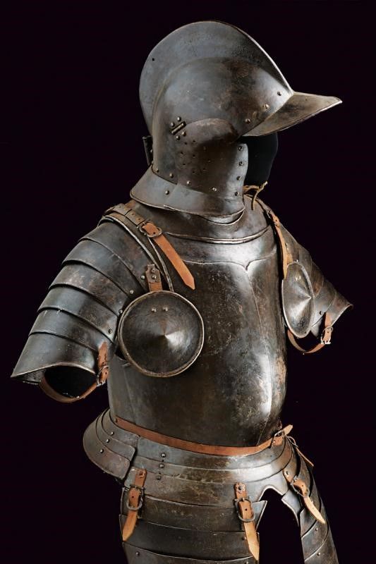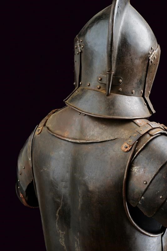 Fine XVI - Inizio del XVII Secolo Con borgognotta a coppo in due metà, recante cresta a sommità liscia, con un foro passante nella parte posteriore; guanciali mobili con fori aeratori disposti a rosetta, tesa appuntita, sul retro una pennacchiera in ferro; i bordi con cordonature semplici, i ribattini in ferro. Gola a spalletti leggermente costolata nella parte anteriore, con scollo a tre lame; spalle a sei lame con cordonature lisce. Robusto petto costolato in mezzeria, con scollo e giri ascellari ribaditi, nella parte alta spigolature, la falda composta da tre lame; la schiena en suite, dotata di tre lame di batticulo. Scarselloni formati da otto lame lisce, i bordi a cordonatura semplice. Coietti parzialmente di restauro. Dotata di rotelline tonde rilevate al centro con spesso bordo ribadito.