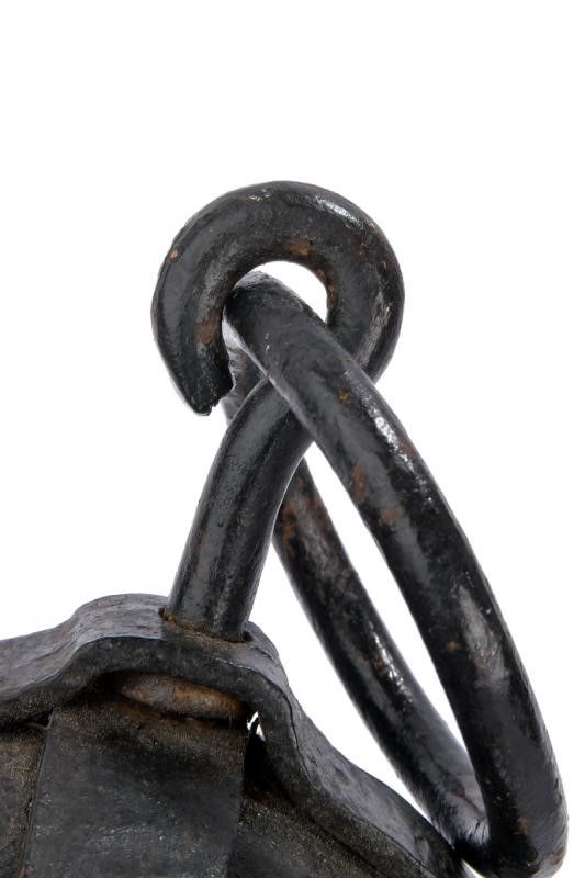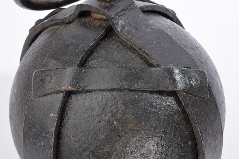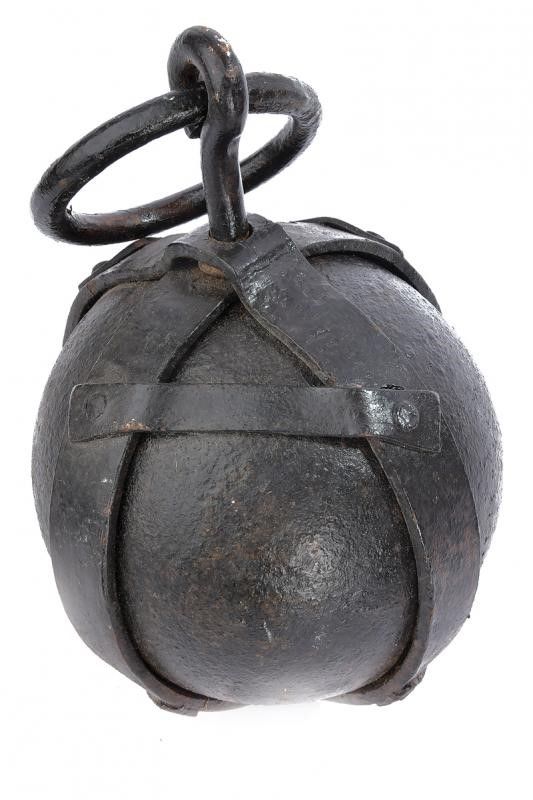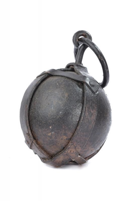 XVII/XVIII secolo Palla sferica in ferro, tenuta da bande rivettate e munite di un grande anello. Molto rara.