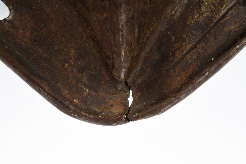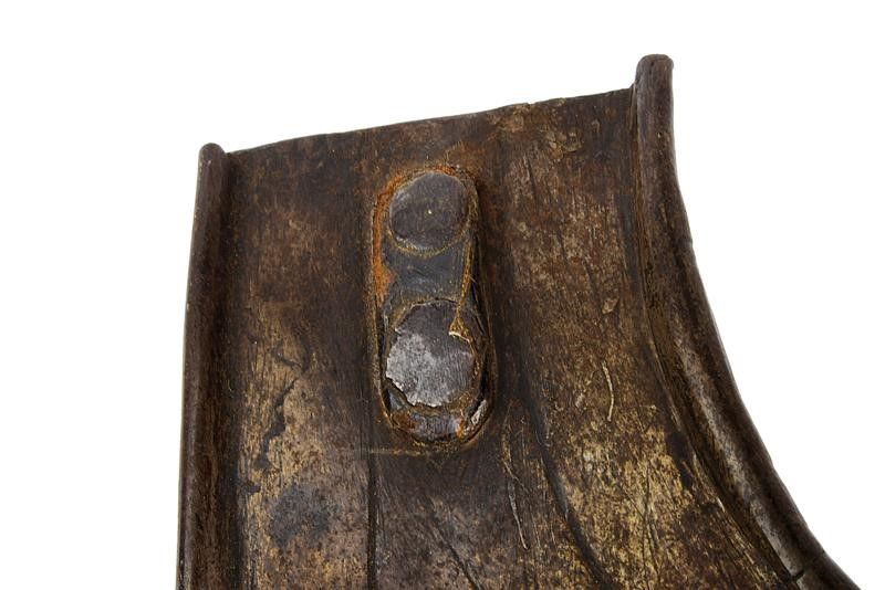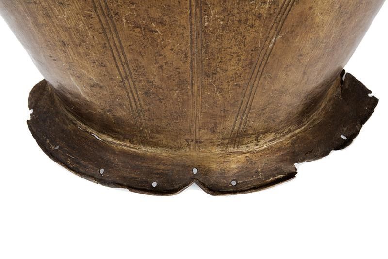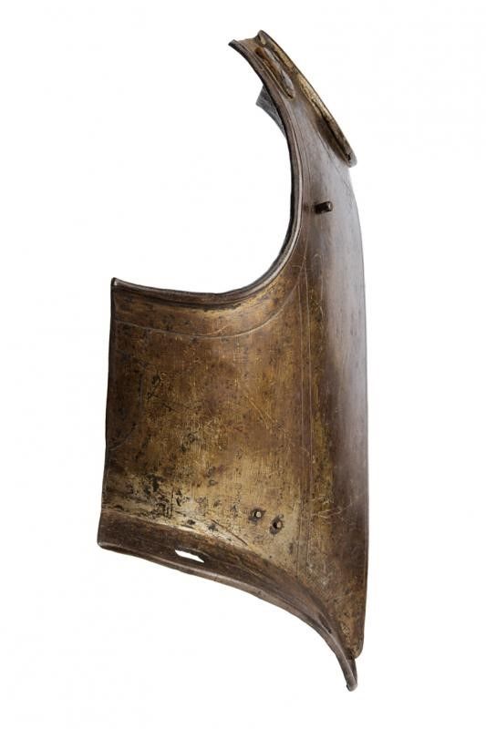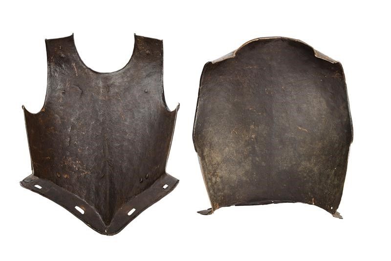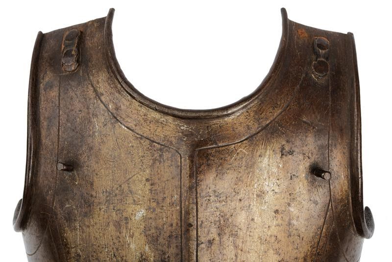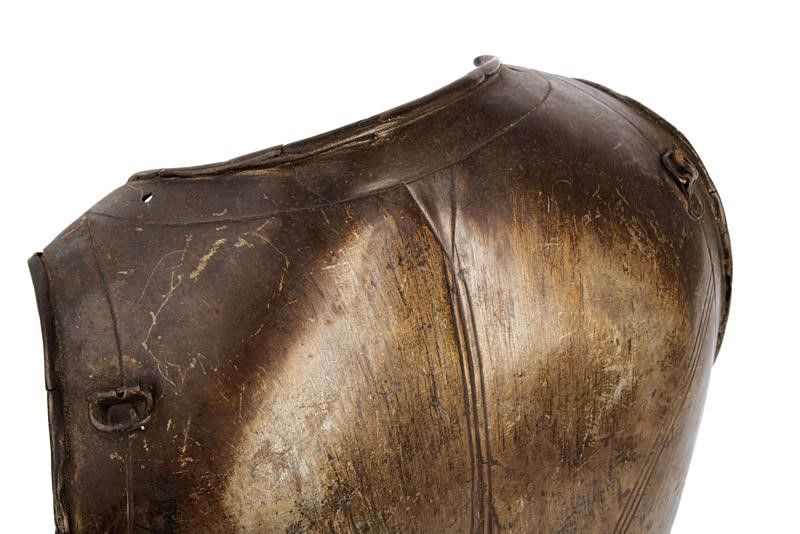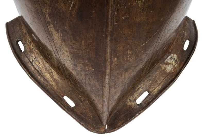 Francia, altezza 47 cm. 1620 circa Il petto costolato in mezzeria decorato con linee, scollo e giri ascellari con bordo alzato. La base con sporgenza obliqua (crepa al centro) munita di fori per il fissaggio alle scarselle. Le spalle e i fianchi in basso con resti di rivetti e coietti. Due perni vicino ai giri ascellari. La schiena decorata a triplice linee con scollo e giri ascellari alzati, la sporgenza con piccole mancanze e danni, le spalle con fibbia.