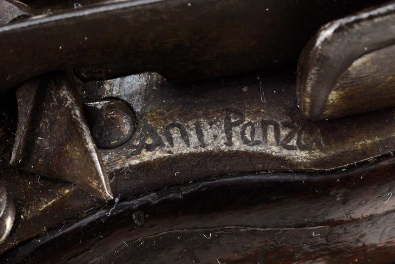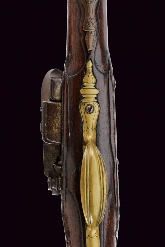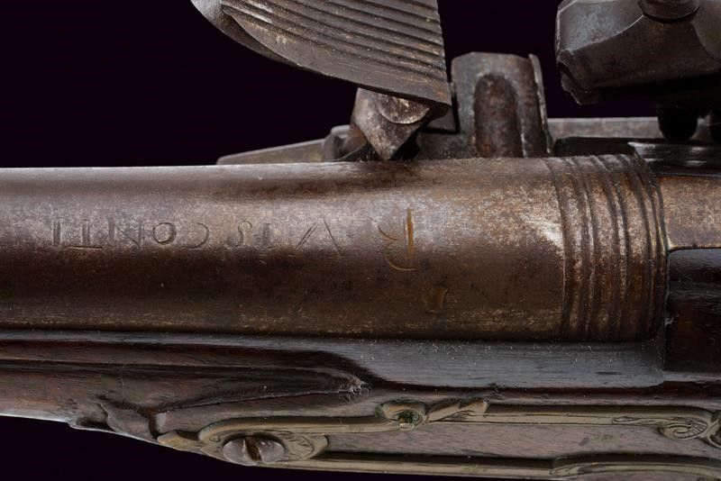 Napoli, lunghezza 50 cm. Seconda metà del XVIII secolo Canna tonda a due ordini con un'anellatura al cambio, culatta decorata a tre anellature, firma R.Visconti, volata clalibro 17 mm. Batteria alla micheletta firmata Ani Penza. Cassa intera in legno leggermente scolpito e con fornimenti in ottone; la contropiastra traforata ed incisa, il ponticello nervato e la coccia con mascherone al centro. Il muso con resti di corno. Completa di bacchetta in legno con cavastracci in ferro e battipalla in corno.