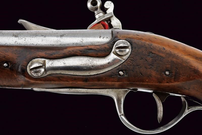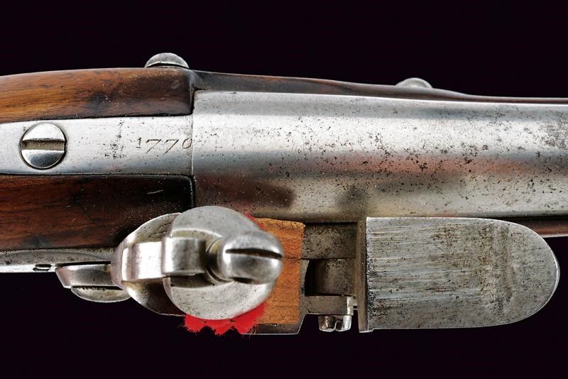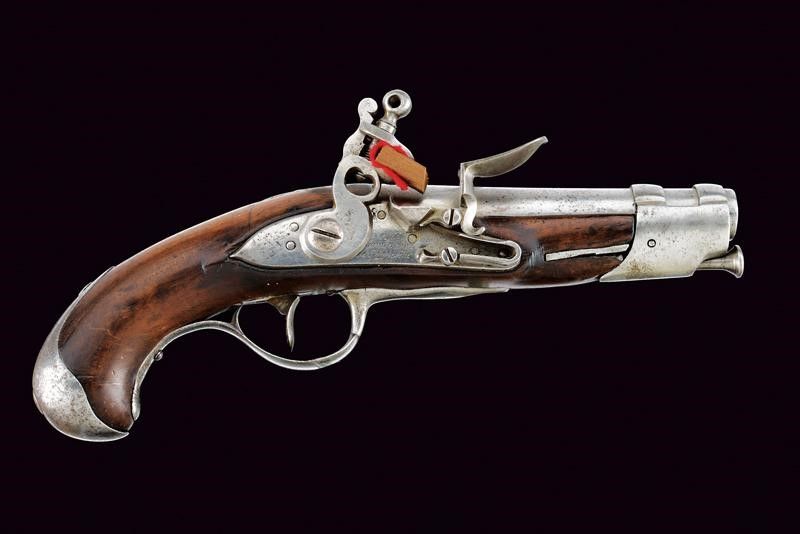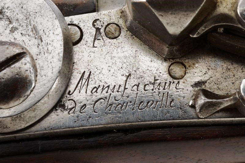 Francia, lunghezza 24.5 cm. fine del XVII Sec. Canna tonda liscia, con resti di marcatura alla base, codetta incisa 1770, cal. 14 mm; batteria con cartella marcata Manufacture de Charleville., punzonata con una A e munita di scodellino faccettato in ferro; cassa intera in legno con resti di marchi dietro alla contropiastra, fornimenti e bacchetta in ferro.