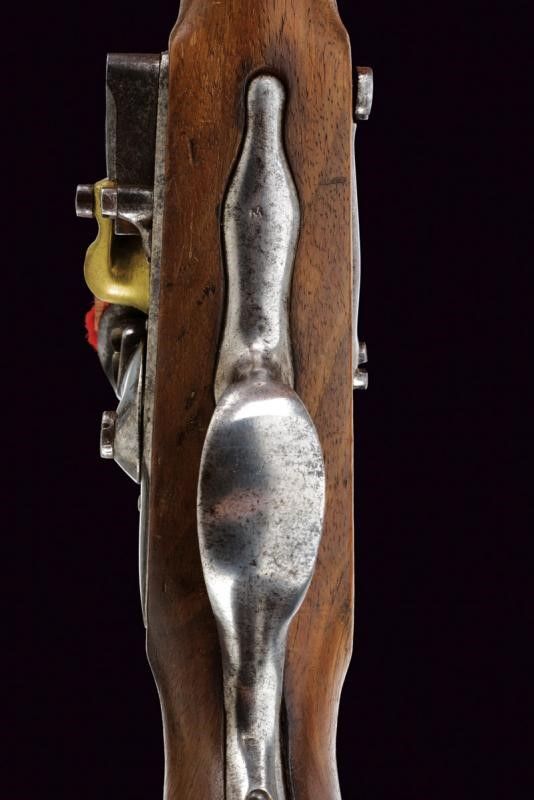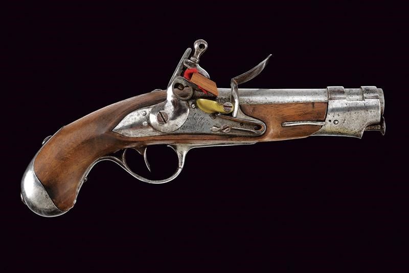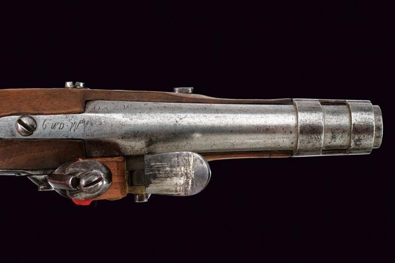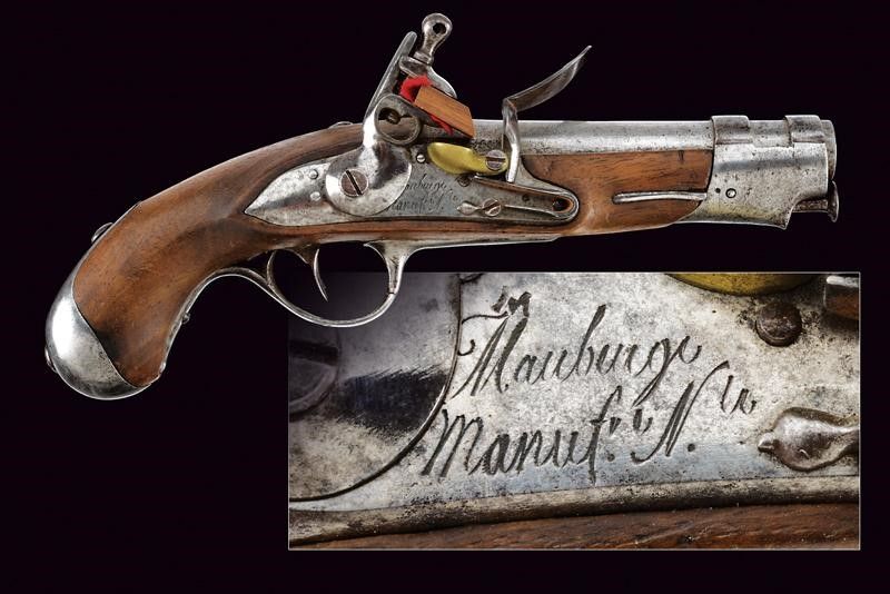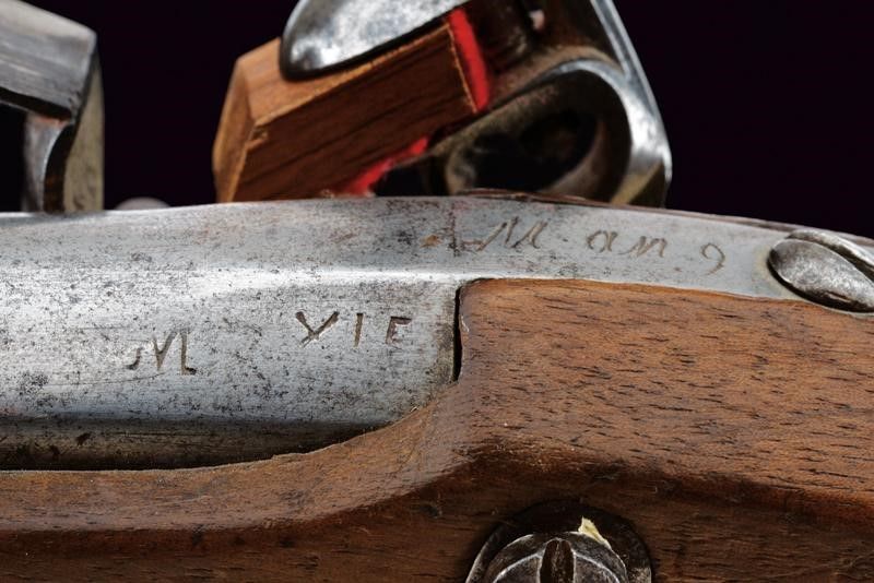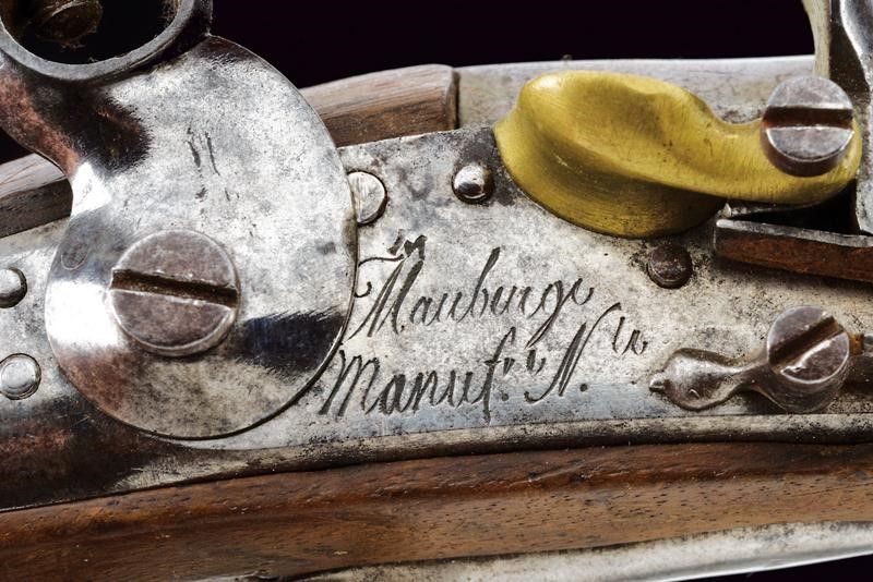 Maubeuge, lunghezza 24 cm. Inizio del XIX Secolo Canna tonda liscia con culatta ottagonale, con resti di marcature alla base fra i quali M, codetta incisa M. an. 9; cal. 15 mm in volata. Batteria con cartella marcata Maubeuge Manuf.re N.le, punzonata con una M e munita di scodellino in ottone; cassa intera in legno con resti di marchi dietro alla contropiastra, fornimenti in ferro. Bacchetta in ferro.