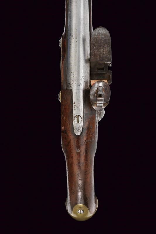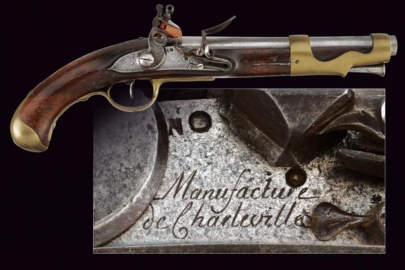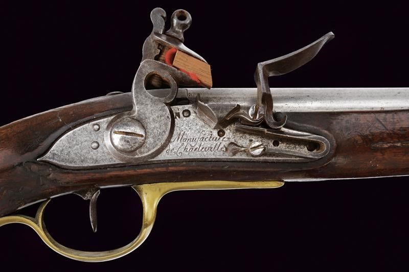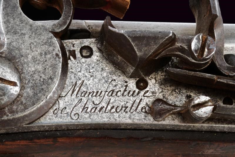 Charleville, lunghezza 40 cm. Seconda metà del XVIII secolo Canna tonda liscia, cal. 17.7 mm. Batteria a cartella piatta con marcatura Manufacture de Charleville e punzonata N. Cassa intera in legno (mancanze e piccoli danni) con resti di timbri ( fra i quali B 73) vicino alla contropiastra. Fornimenti in ottone, bacchetta in ferro. Meccanica funzionate.