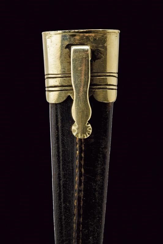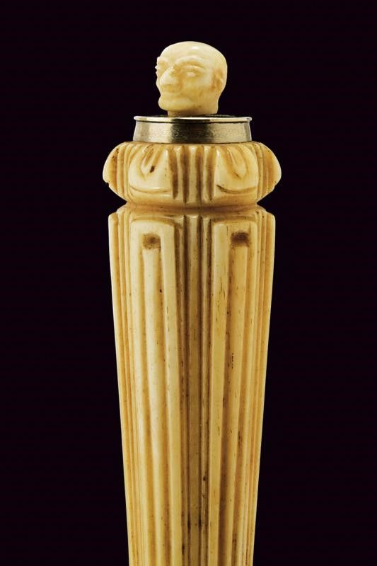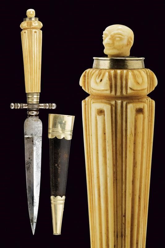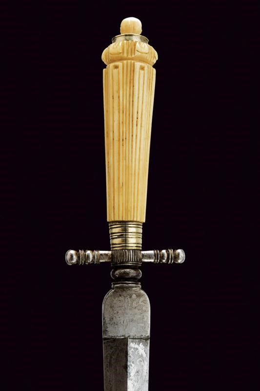 Francia, lunghezza 27 cm. Prima metà del XIX Secolo Lama dritta a due fili di sezione a losanga con punta rinforzata e spesso tallone, quest'ultimo e parte della lama con resti di incisioni a trofei e motivi floreali. Fornimento in ferro, elso a bracci dritti intagliati a sfere intervallate da anelli, massello inciso a bande, ghiera in metallo bianco. Impugnatura e pomo in osso, la prima decorata a scanalature longitudinali, il pomo raffigurante la testa di una figura umana. Completo di fodero con fornimenti in metallo bianco.