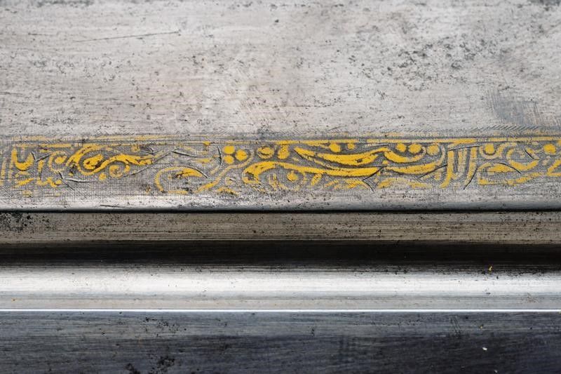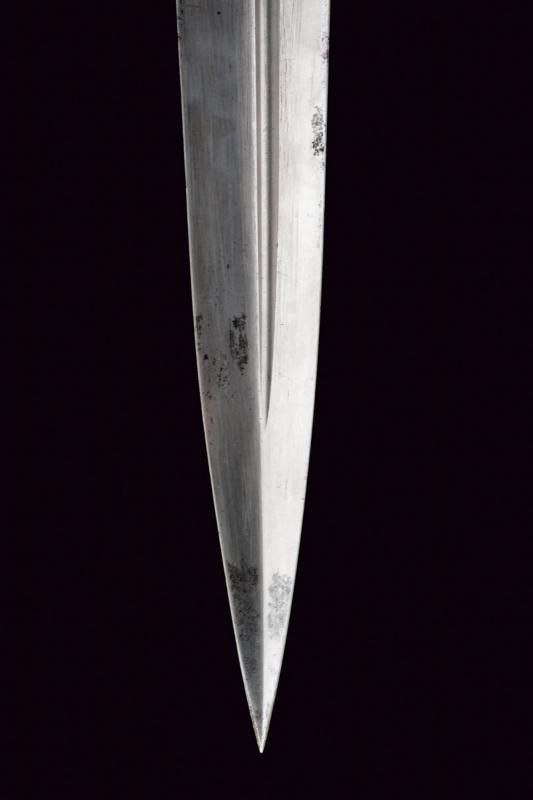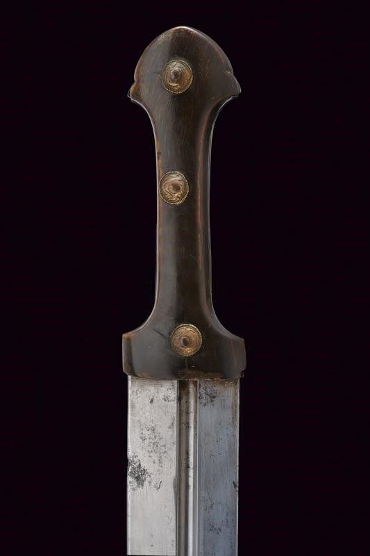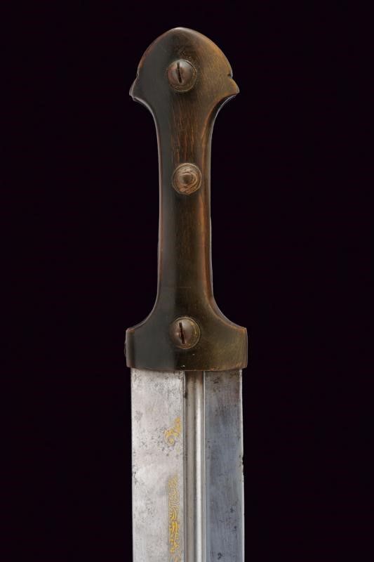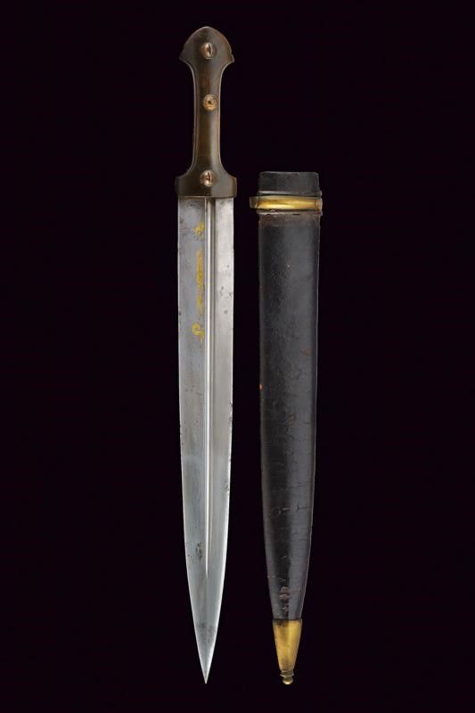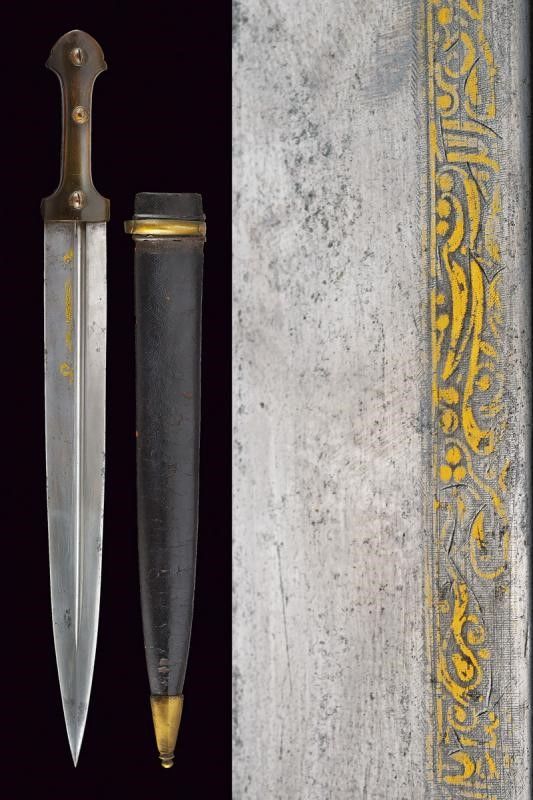 Caucaso, lunghezza 58.5 cm. 1880 circa Ampia lama a due fili con scanalature asimmetriche. Su un lato resti di decorazioni in oro. Impugnatura con guancette in corno e rivetti in ottone con resti di doratura. Fodero in legno rivestito di cuoio con fornimenti in ottone.