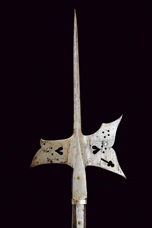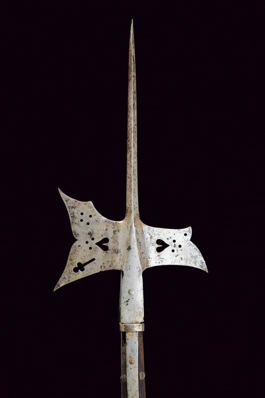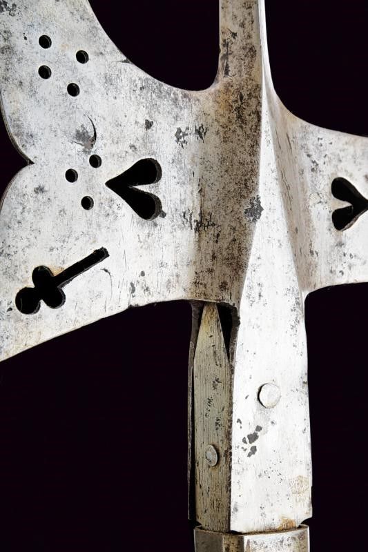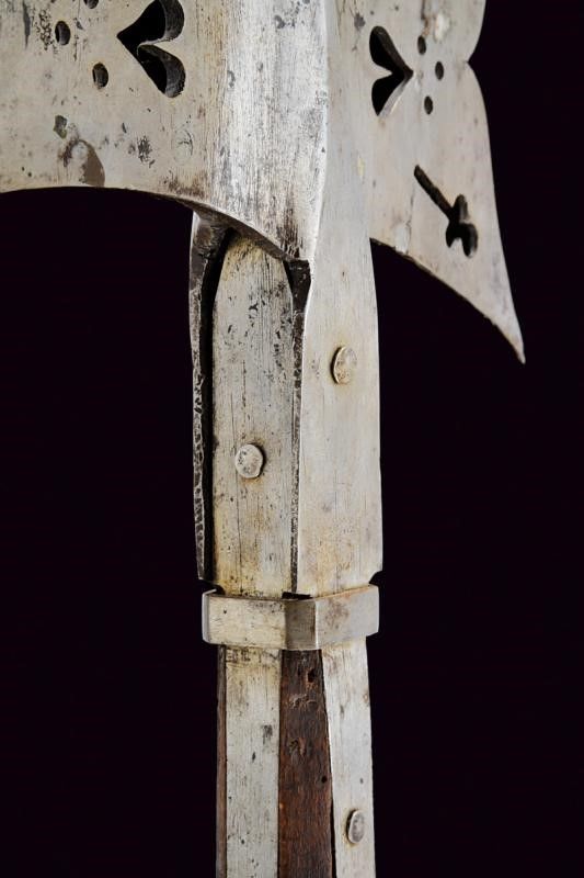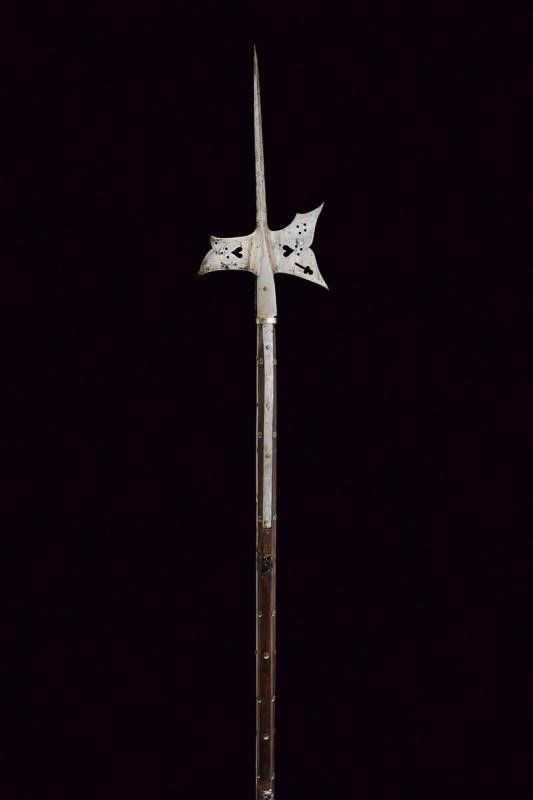 Germania, lunghezza 186 cm. XVII Secolo Robusta cuspide di sezione quadra; scure con apertura ad ali e traforata con trifoglio, cuore e cerchi, il becco lavorato in modo simile (alcuni piccoli restauri). Fissato con quattro bandelle piatte su funzionante fusto ligneo leggermente accorciato, di sezione ottagonale (piccoli danni da tarme e restauri), decorato da rivetti.