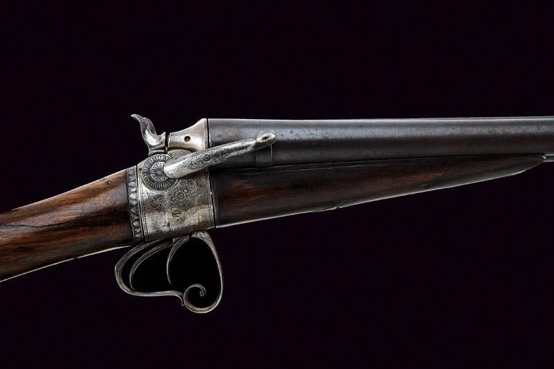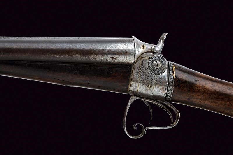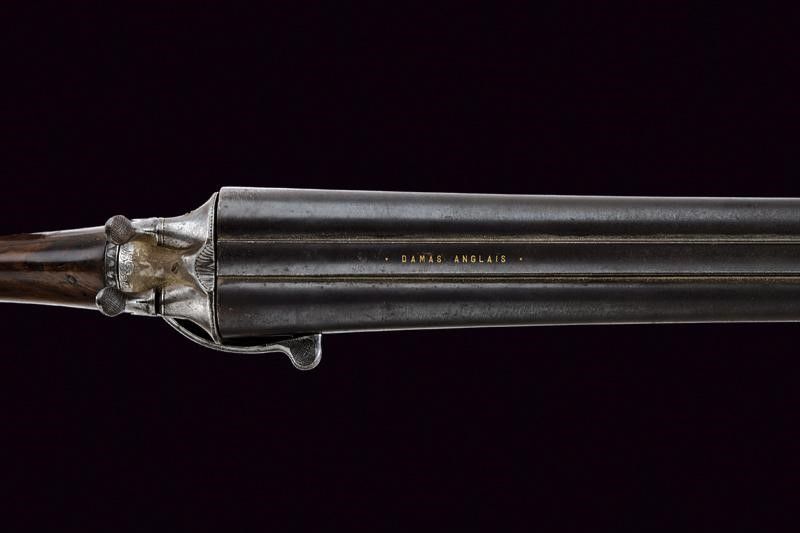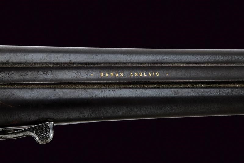 Francia, lunghezza 144.5 cm. terzo quarto del XIX Sec. Canne tonde lisce con bindella concava marcata DAMAS ANGLAIS in oro, mirino, cal. 12; castello in ferro inciso a motivi floreali, sul lato destro leva per caricare i cani; castello, canne e calcio velocemente svitabili; ponticello in ferro inciso, calcio ed astina in legno. Interessante sistema. In patina.