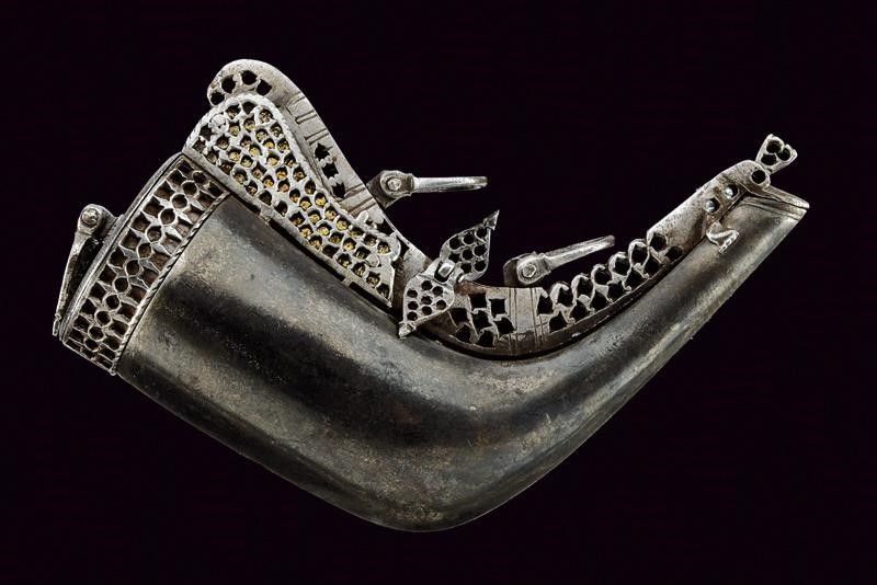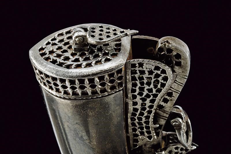 Persia, lunghezza 14.5 cm. Prima metà del XIX Secolo Corpo curvo, liscio, brunito, in damasco, con fornimenti in acciaio riccamente traforato, alcune parti con fondo color oro messo a giorno, altri erano probabilmente smaltati un tempo. La chiusura della molla lavorata a effigiare un rettile stilizzato. Due anelli di sospensione ed un pendente mobile.