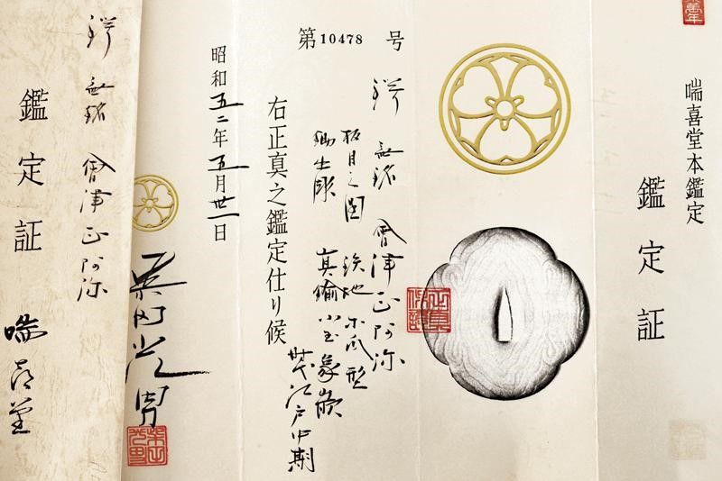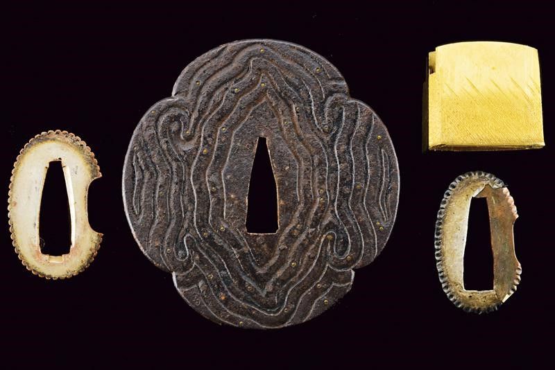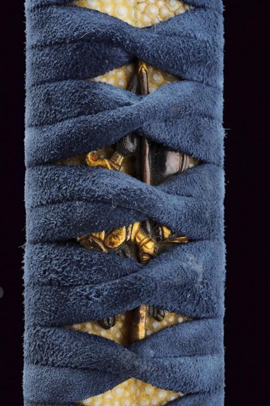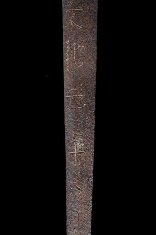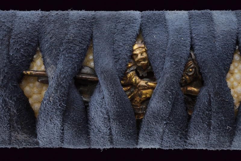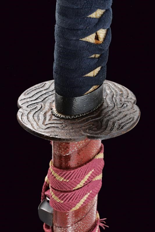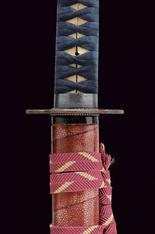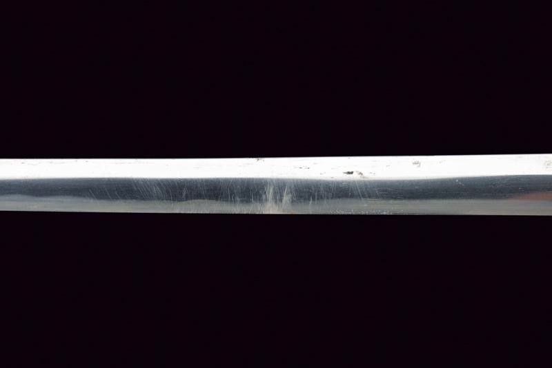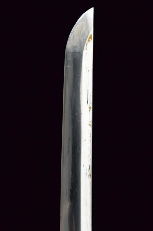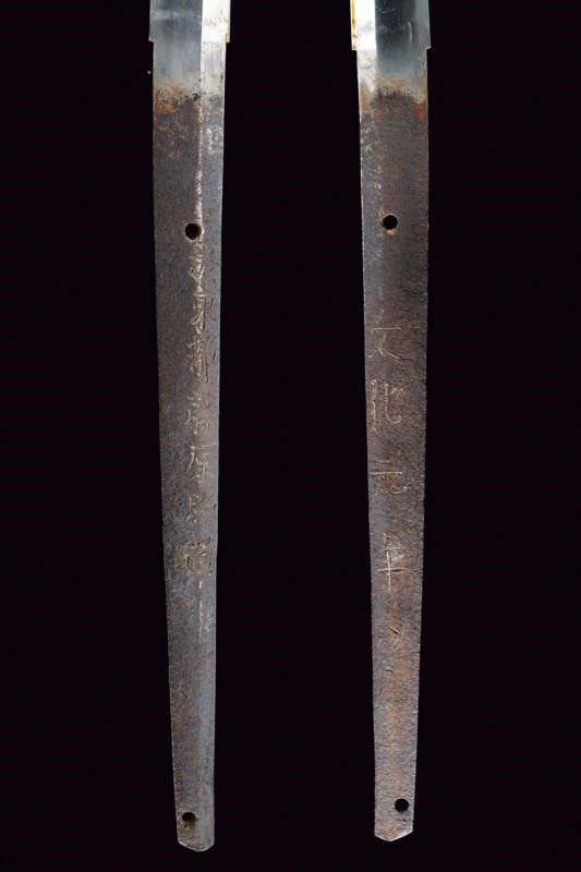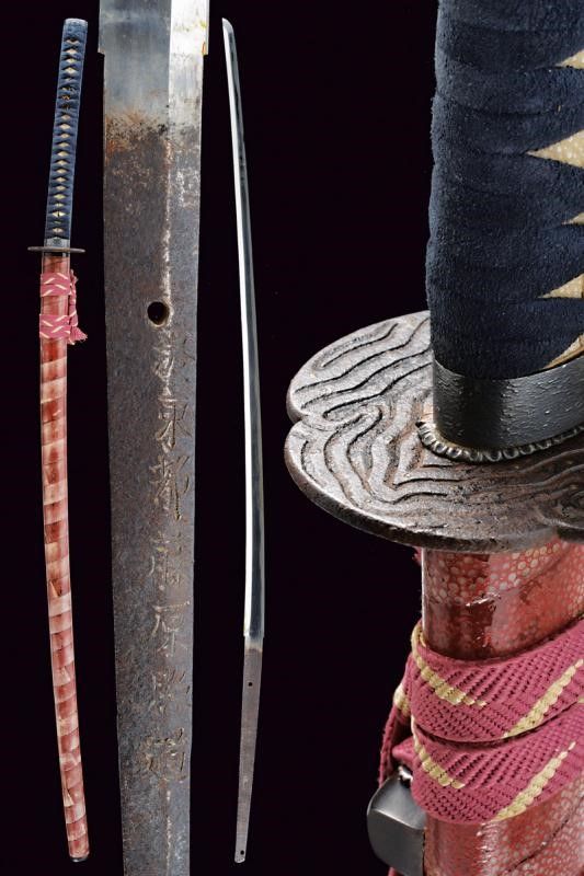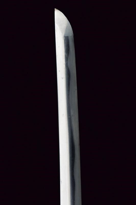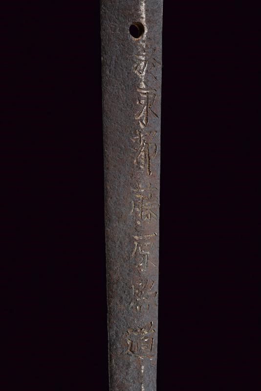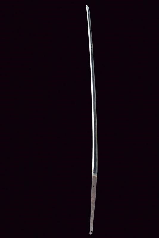 Giappone, lunghezza 143,5 cm. Periodo Edo (1603-1867) Lunghissima lama Shinogi-zukuri, Maru-mune . Nagasa: 105,5 cm. Hamon e hada discretamente visibili. Qualche kizu. Nakago-jiri: Iriyamagata. Mei: Toto ni Fujiwara Terumichi. Due Mekugi-ana. Epoca Shinshinto. Habaki in metallo dorato. Tsuba in ferro d'epoca tardo Edo, Mokko-gata ornata a nuvole intagliate. Fuchi-Kashira in metallo non ferroso. Menuki con effigi di Bushi armati di lance. Spessa Tsuka-ito (più tarda?) in pelle.