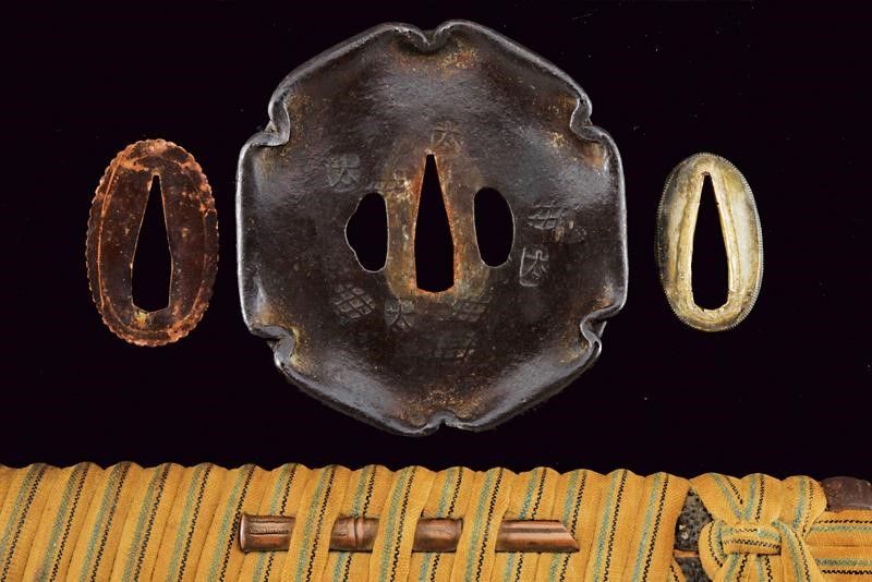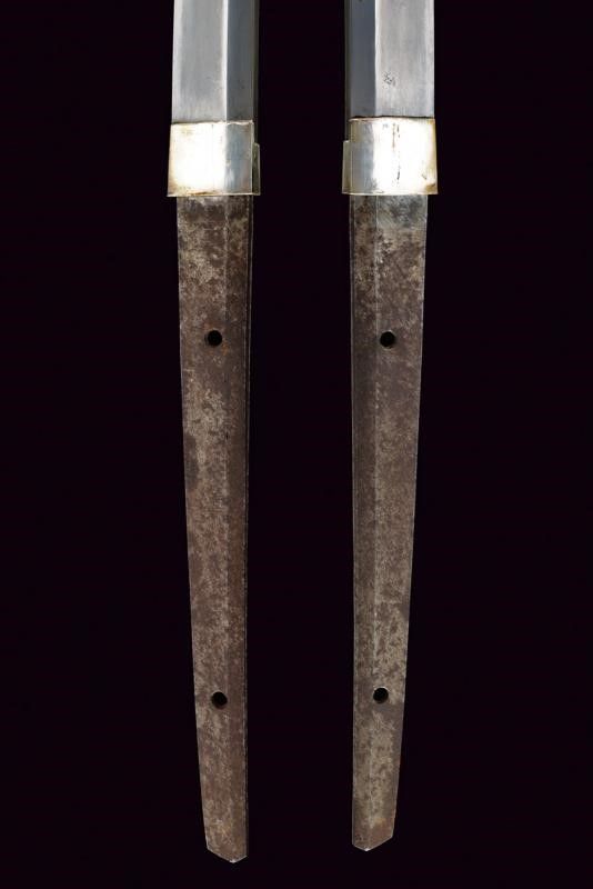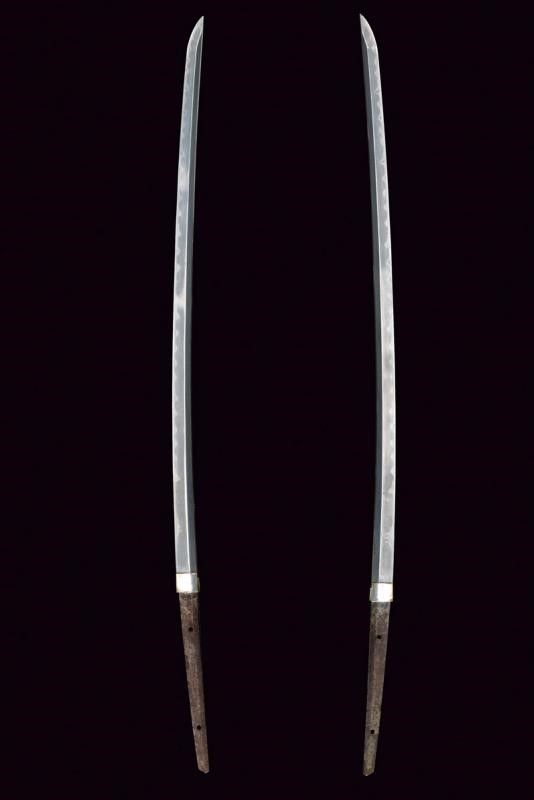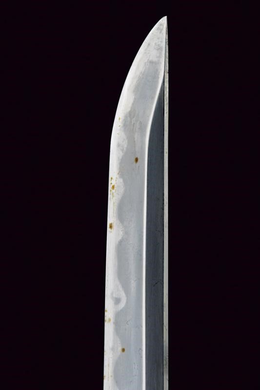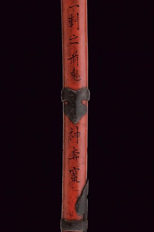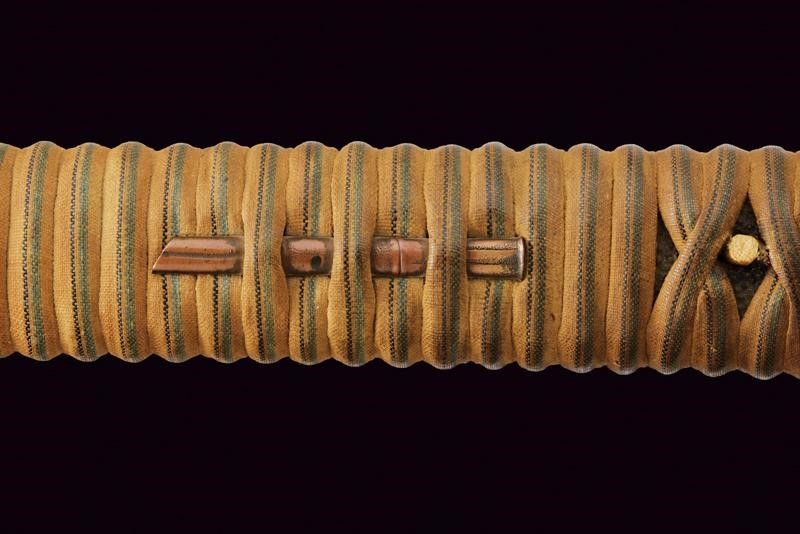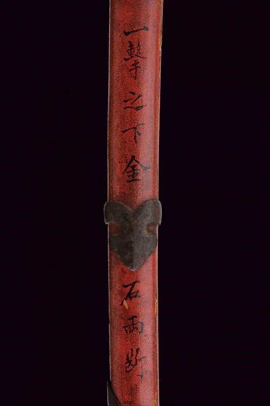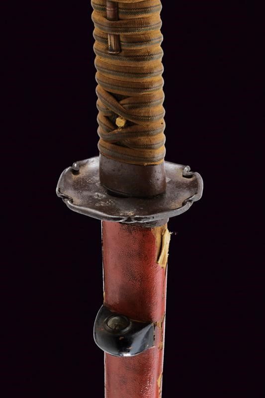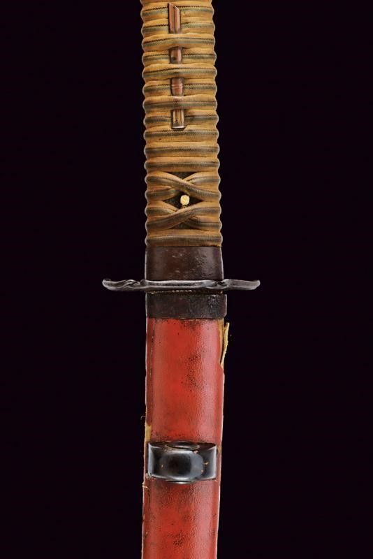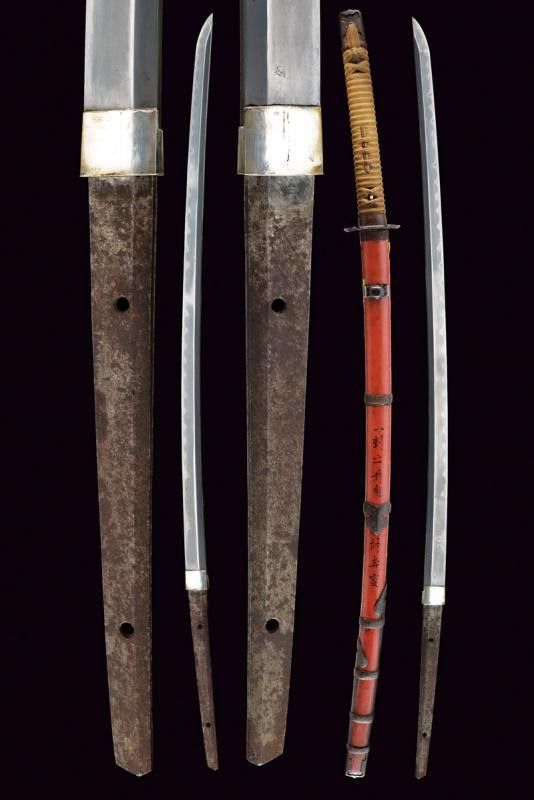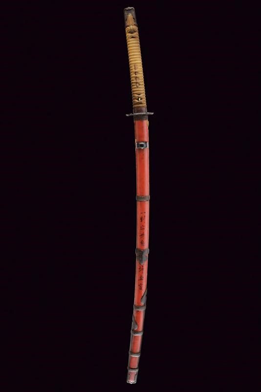Giappone, lunghezza 133 cm. Periodo Edo (1603-1867) Potente lama Shinogi-zukuri, Iori-mune. Nagasa: 93,7 cm. Hamon ben visibile. Gunome Midare, Hada non chiaramente visibile. Qualche kizu di tipo non grave. Nakago-jiri: Iriyamagata. Mumei. Due Mekugi-ana. Epoca Shinshinto (1781-1876) Habaki in rame rivestito in lamina d'argento. In Koshirae sul tipo Handachi, con tsuba antica d'epoca Edo tardo, in ferro con bordo lavorato a petali e timbri sulla superficie. Fuchi e kabutogane con con finitura rugginosa. Vecchia Same in pelle di razza tinta nera. Tsuka-ito in tessuto tricolore. Menuki sempre d'epoca lavorati a bambù in rame. Saya in legno laccato rosso (difetti, piccole mancanze e segni del tempo alla finitura) con iscrizione, fornimenti metallici finiti come il Fuchi e il Kashira.
