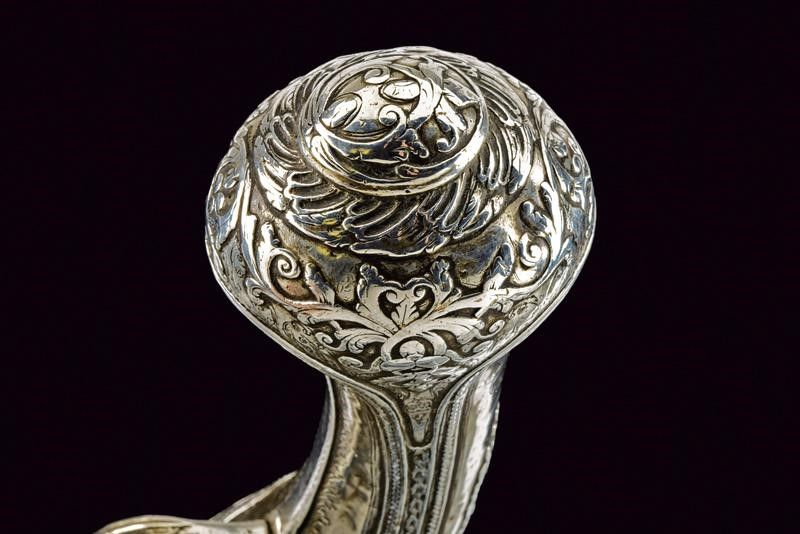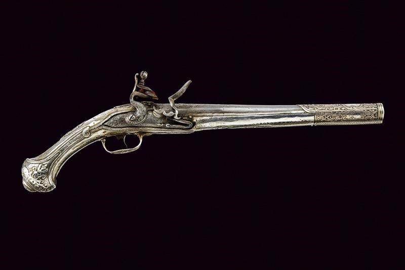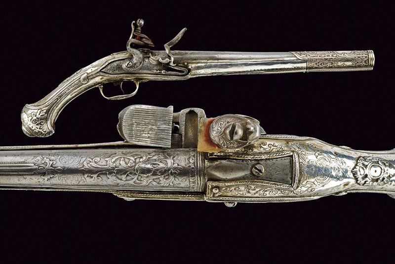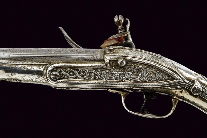 Turchia, lunghezza 48 cm. 1800 circa Canna liscia tonda con base quadra; la prima parte finemente intagliata con un mascherone fra decori floreali in bassorilievo, in seguito una bindella nervata, cal. 15 mm; codetta con bordi incisi con un fiore, munita di traguardo. Bella batteria a pietra focaia finemente incisa ed intagliata a motivi floreali, parzialmente in bassorilievo. Cassa intera completamente ricoperta con lamina d'argento riccamente inciso ed intagliato a motivi floreali. Il reggicanna, sempre in argento, decorato en suite.