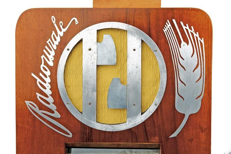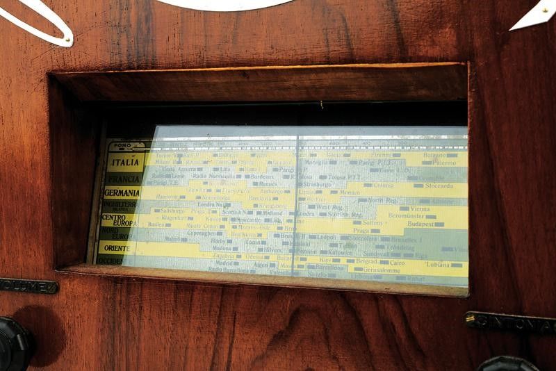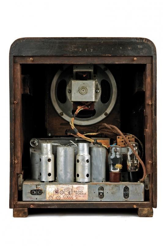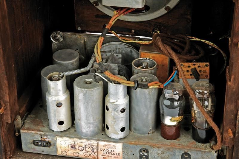 Italia, altezza 49,5 cm. Prima metà del XX Secolo Mobiletto in legno con fregi anteriori in metallo, iscrizione Radiorurale, spiga di grano e, al centro placche a effigiare il doppio fascio littorio. Fodera dell'altoparlante in tessuto. Interno con valvole. Insieme con un'antenna realizzata dal proprietario.