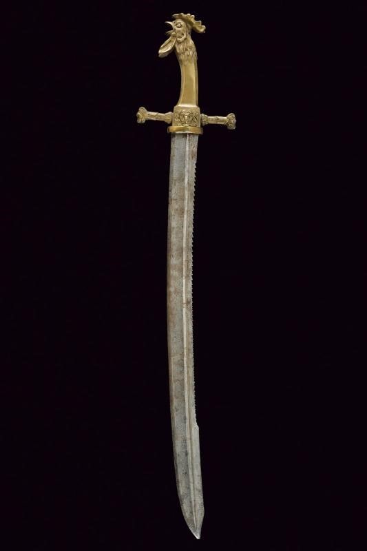 Francia, lunghezza 89 cm. 1813 Pesante e larga lama (alcuni danni da ruggine) leggermente curva a un filo e controfilo con ampio sguscio e profonda scanalatura, dorso a sega. Bellissimo fornimento in ottone massiccio, bracci dell'elso datati 18/13 e terminanti a testa di leonessa, massello con grandi teste di leone e pomo a testa di gallo. Impugnatura faccettata. Priva di fodero.