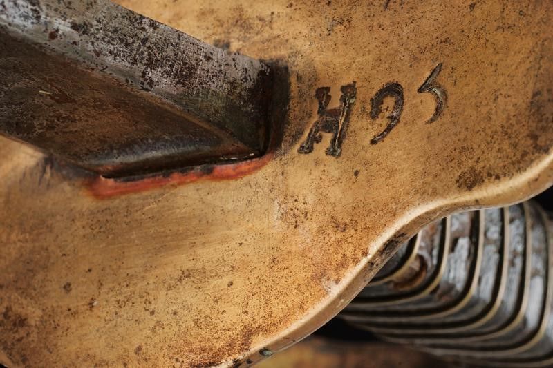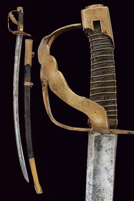 Francia, lunghezza 108 cm. fine del XVIII Sec. Lama curva a un filo e breve controfilo, sgusciata per quasi tutta la lunghezza, recante alla base tracce di un punzone. Varie evidenti intaccature. Fornimento in ottone con ampio elso a coccia recante resti di una marcatura non chiaramente leggibile e timbro H93. Guardia a due rami, il terzo mancante, quello principale timbrato HN.86. Impugnatura di sezione quadra con rivestimento in vecchia manica di cuoio ed avvolgimento in filo d'ottone. Piccoli danni e mancanze, segni d'uso e del tempo. Cappetta corta quadra. Fodero in cuoio (danni e mancanze) con fornimenti in ottone a due campanelle.