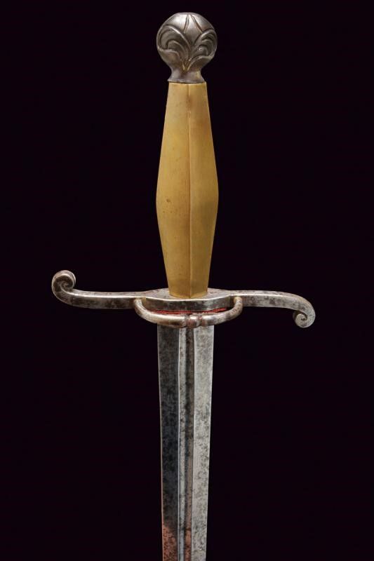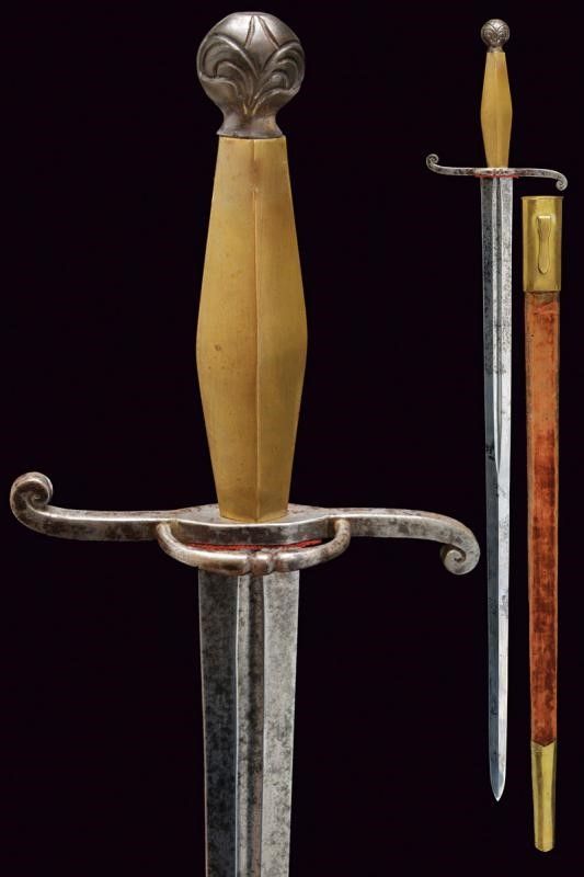Stato Pontificio, lunghezza 96 cm. Fine del XIX Secolo Lama ditta a due fili con sguscio centrale nella prima parte, dopo di sezione a losanga; elso in ferro a S con anello di guardia con sfera al centro. Pomo sferico in ferro inciso a motivi floreali, impugnatura in bronzo di sezione esagonale che va ingrossandosi verso il centro. Fodero in legno rivestito di velluto marrone (stinto e liso) con fornimenti in ottone.