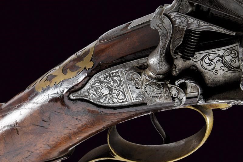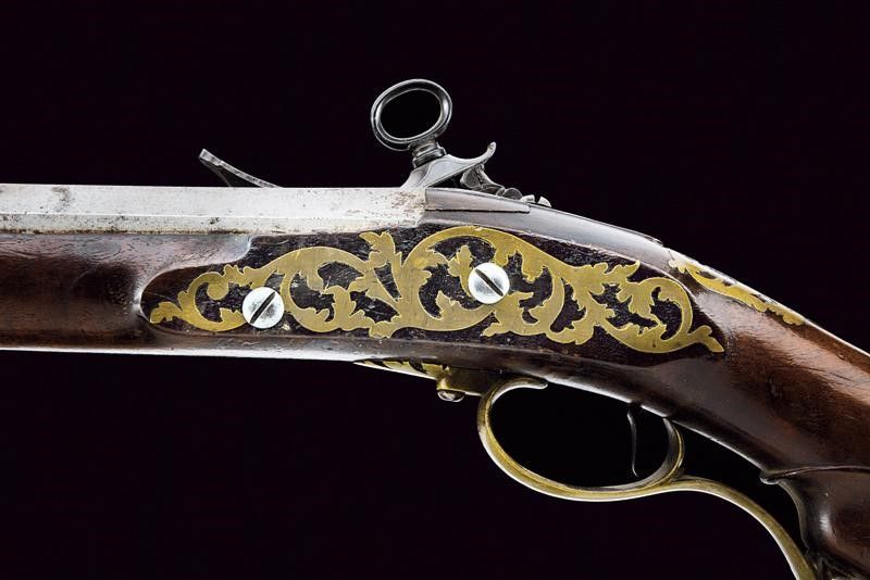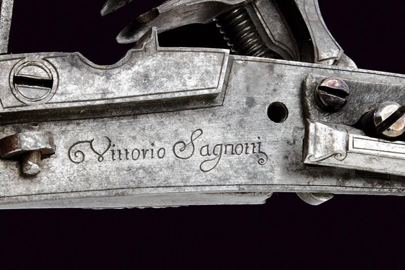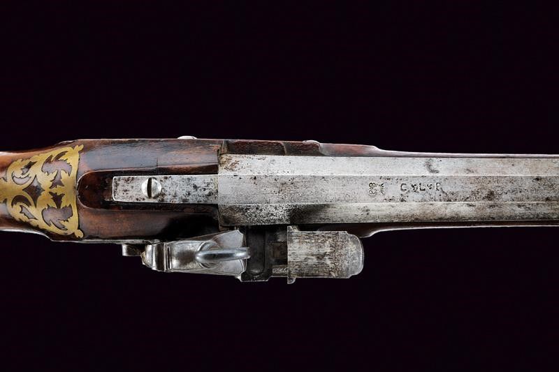 Prima metà del XVIII Secolo Lunghissima canna liscia a due ordini, ottagonale e faccettata, dotata di punzone coronato al dorso seguito dalle lettere C L P, recante al cambio anellature. Il mirino in ottone, la volata leggermente strombata, cal. 17,7 mm. Batteria a pietra con cartella a bordi obliqui, la codetta ribassata ornata con un mascherone inciso, incisi anche il collo del cane, le ganasce, le molle e lo scodellino. La testa del vitone lavorata a fiore. Il retro della piastra con la firma Vittorio Sagnotti e con delineature. Mezza cassa in legno con pala sgusciata, un paio di tasselli restaurati. Fornimenti in ottone. Scudetto dorsale, reggibacchetta e contropiastra lavorati a traforo a foglie. Bacchetta in legno con battipalla in corno di mucca.