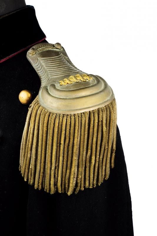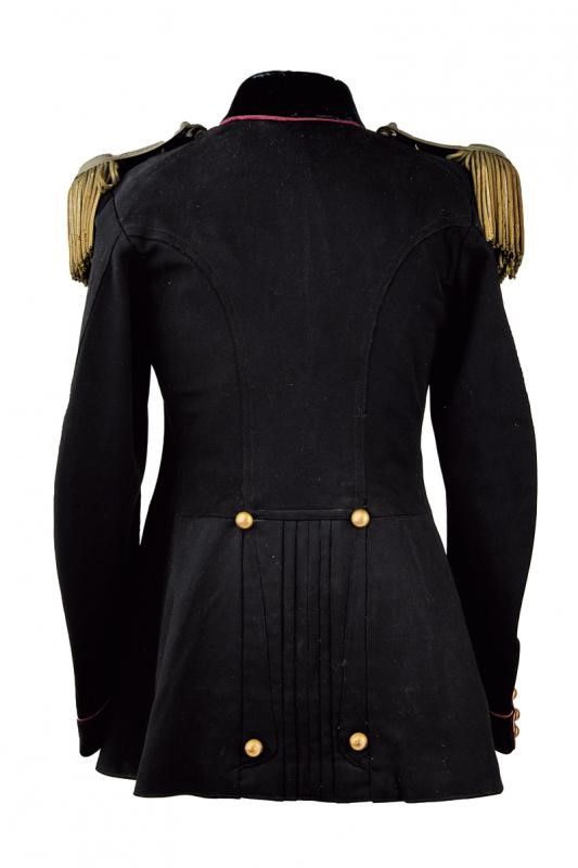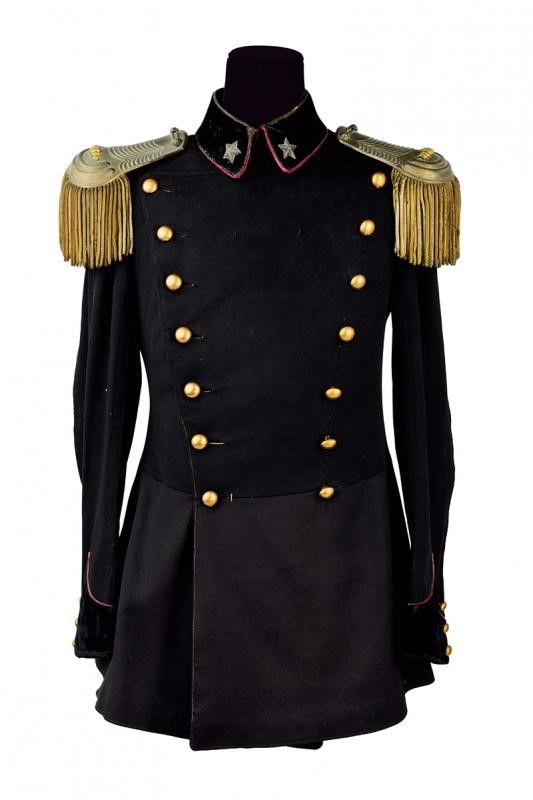 Regno d'Italia, altezza jacket circa 74 cm. 1903-1914 In panno bruno con paramani e colletto in velluto profilati in rosso. Bottoni dorati con marcatura dell'Unione Militare. Stellette metalliche al colletto. Fodera interna in tessuto nero. Segni d'uso e del tempo, ma apparentemente senza fori di tarma. Insieme con un paio di spalline da ufficiale medico in metallo tipo ottone con fregio da medico recante resti di doratura; la sottopannatura nera con gancio recante marcatura dell'unione militare e resti di argentatura.