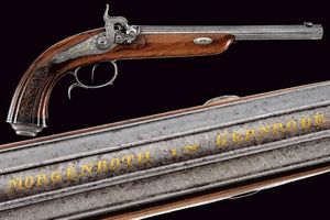 Sassonia, lunghezza 42.5 cm. 1840 circa Canna tonda rigata, con otto nervature longitudinali, in fine damasco, [..]