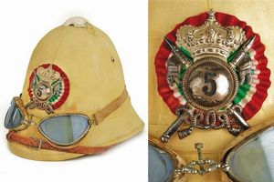 Regno d'Italia, altezza 24.5 cm. 1915 Corpo in sughero rivestito in lino color panna, di fronte fregio reggimentale [..]