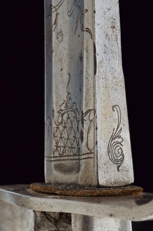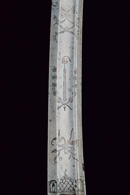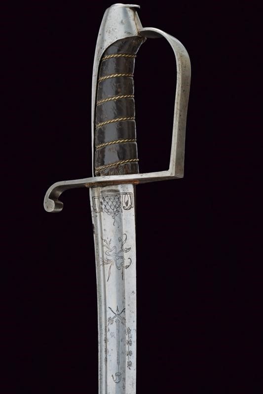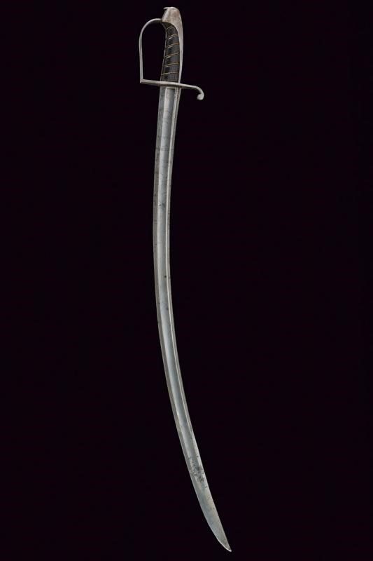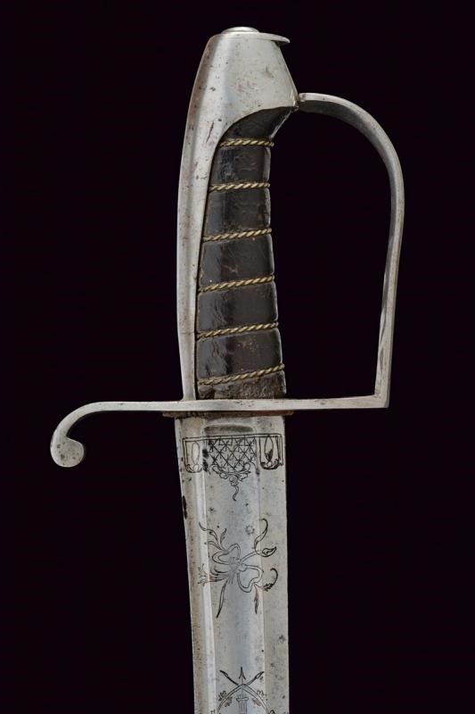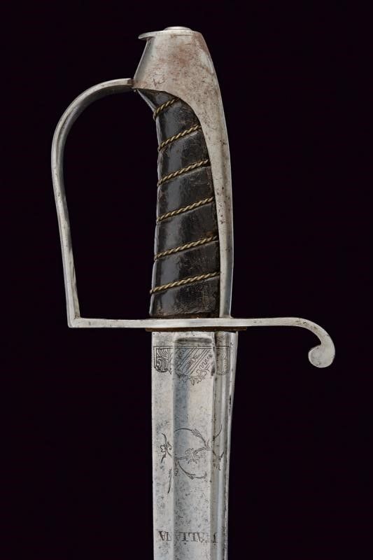 Repubblica Italiana, lunghezza 101 cm. 1802 - 1805 Lunga e robusta lama curva a un filo e breve controfilo sgusciata per quasi tutta la lunghezza e scanalata accanto al dorso; recante al forte sul lato di terza un trofeo e un fiorame che incorniciano il motto VIVA LA REPUBBLICA ITALIANA, sul lato di quarta il fascio littorio sormontato dal berretto frigio rivoluzionario posto fra allori, attorno decorazioni floreali. Larghezza alla base 3,9 cm, lunghezza lama 88 cm. Intaccature al forte. Fornimento in acciaio con guardia a staffa palmata verso l'alto. Braccio di parata incurvato e lobato in testa. Cappetta lunga liscia con piccola cuspide. Impugnatura con rivestimento antico in cuoio e trecciola in ottone. Priva di fodero.