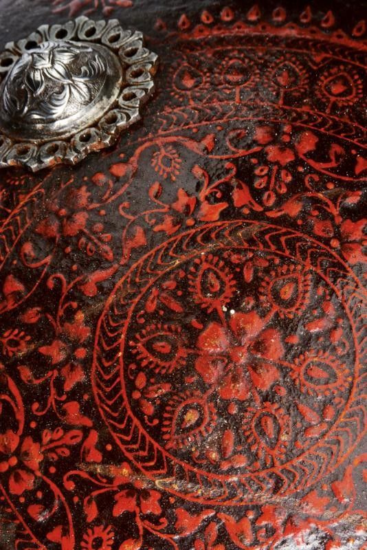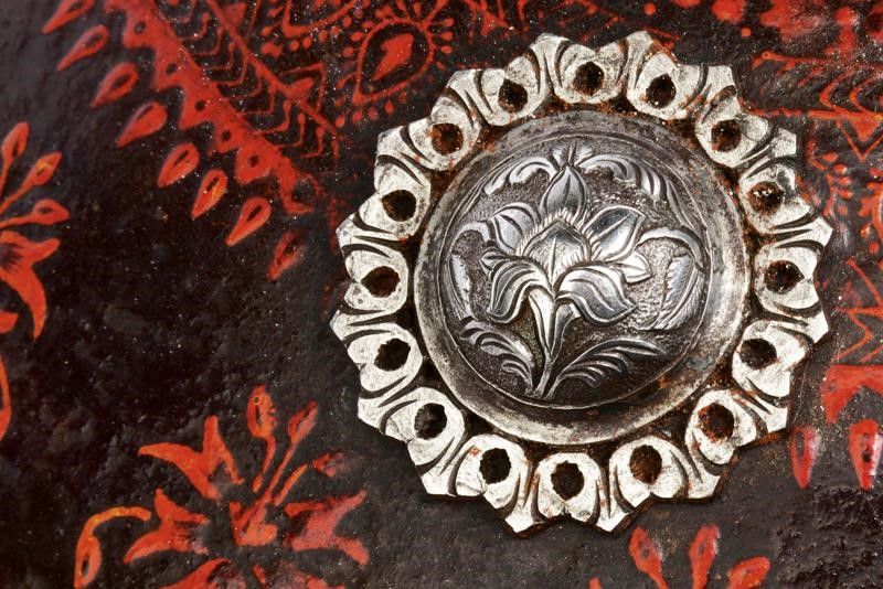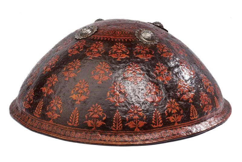 India, diametro 46.5 cm. Metà del XIX Secolo In cuoio di bufalo di forma circolare, ed estremamente convesso, con bordo leggermente volto verso l'esterno, munito di quattro borchie in argento finemente incise a motivi floreali in bassorilievo su fondo granulato e con bordo a petali traforati. Tutta la superficie finemente dipinta a mano a motivi floreali color rosso su fondo nero. All'interno decorazioni a cinque rami dipinti e quattro anelli in ferro di supporto.