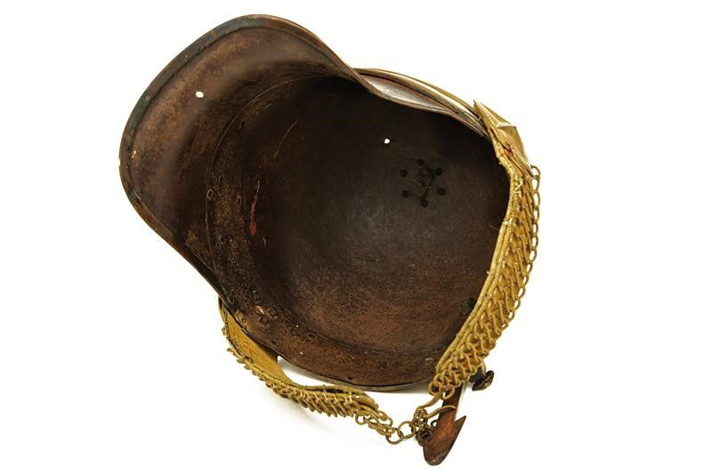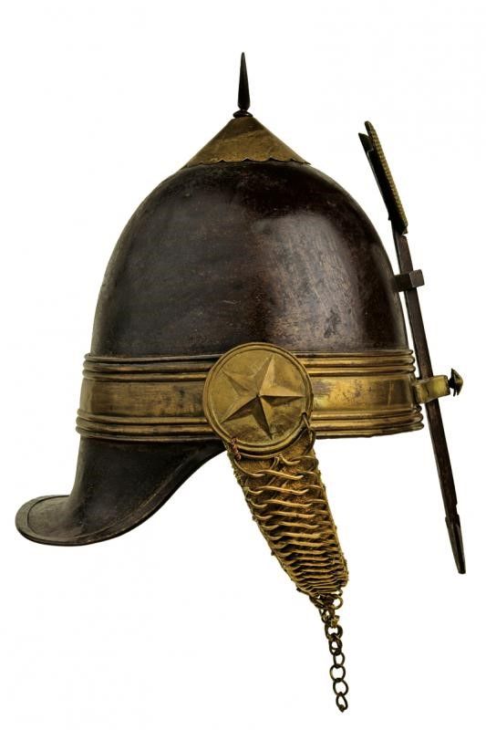 Egitto, altezza 31 cm. Metà del XIX Secolo Coppo e lama di gronda in ferro, con fornimenti in ottone, cuspide sommitale a mezzaluna su rosetta conica, bordo inferiore con banda e coccarde a stelle. Completo di soggolo, protezione nasale regolabile raffigurante un freccia; all'interno fori per imbottitura. Fodera mancante. Segni d'uso e del tempo.
