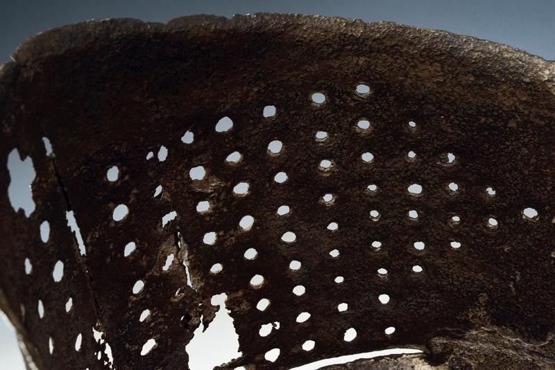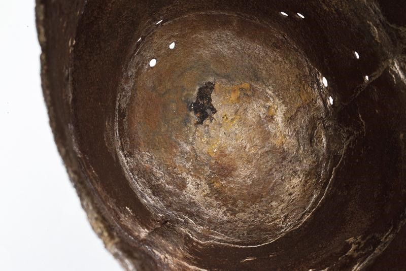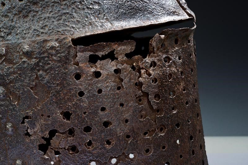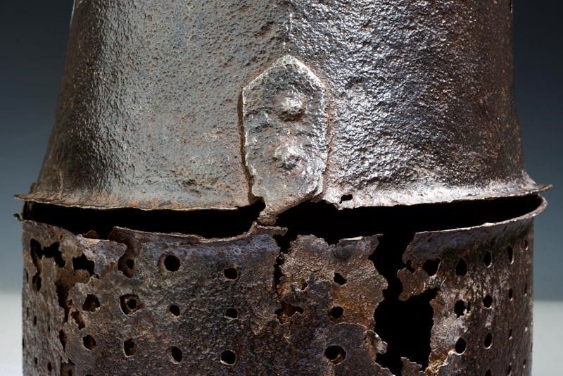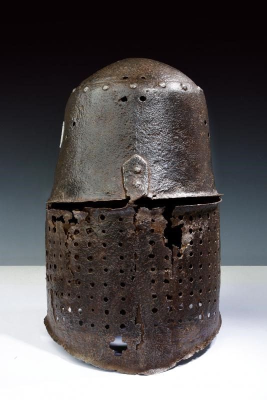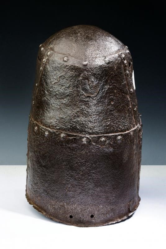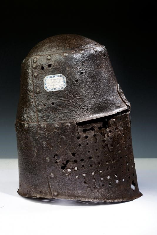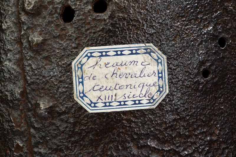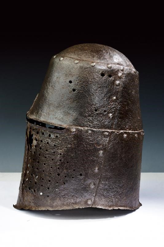 Europa, altezza 36,5 cm. Seconda metà del XIV Secolo Realizzato in ferro. La calotta sommitale in un unico pezzo, il resto del coppo realizzato in due piastre, una frontale e una occipitale, tutte tenute da ribattini. La piastra frontale costolata in mezzeria.La visiera (con mancanze e sfogliature) munita di svariati fori aeratori su entrambi i lati e aria per la vista i cui bordi sono fortemente girati verso l'esterno; al centro una lieve nervatura longitudinale prosegue il disegno della piastra frontale. La lingua di fissaggio munita di due ribattini. In basso sul solo lato destro un grande traforo a croce greca. La piastra di gronda conservata meglio della precedente con margine basale volto verso l'esterno, come anche quello del lato anteriore. Sui fianchi del coppo vari fori per il cimiero.Peso dell'elmo: 2,79 Kg. In bella patina marrone antica.