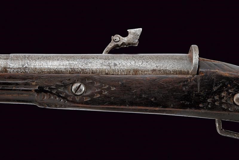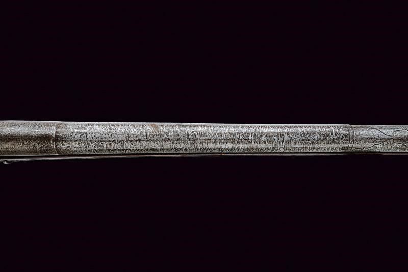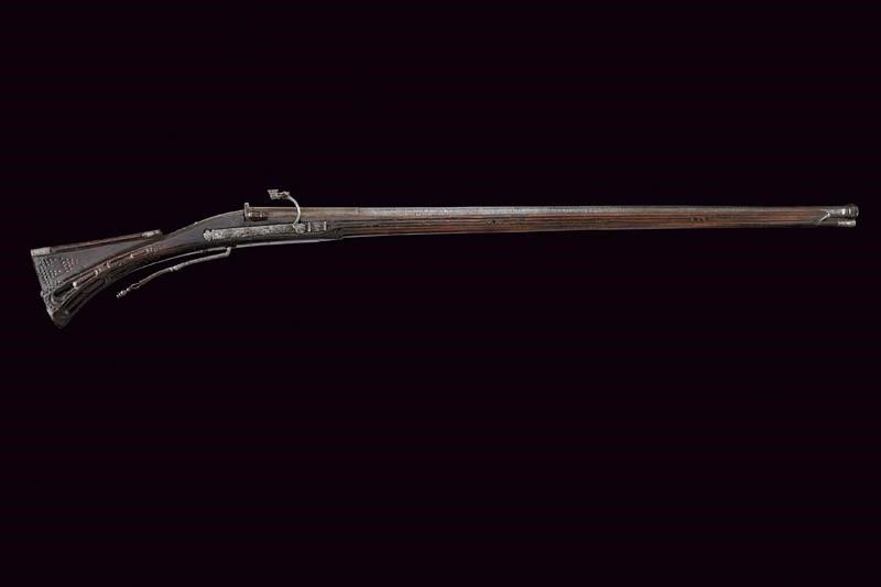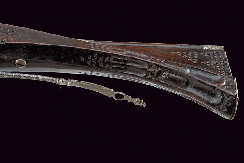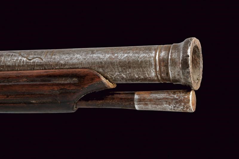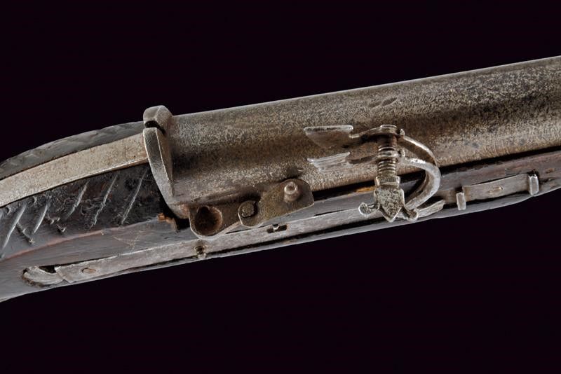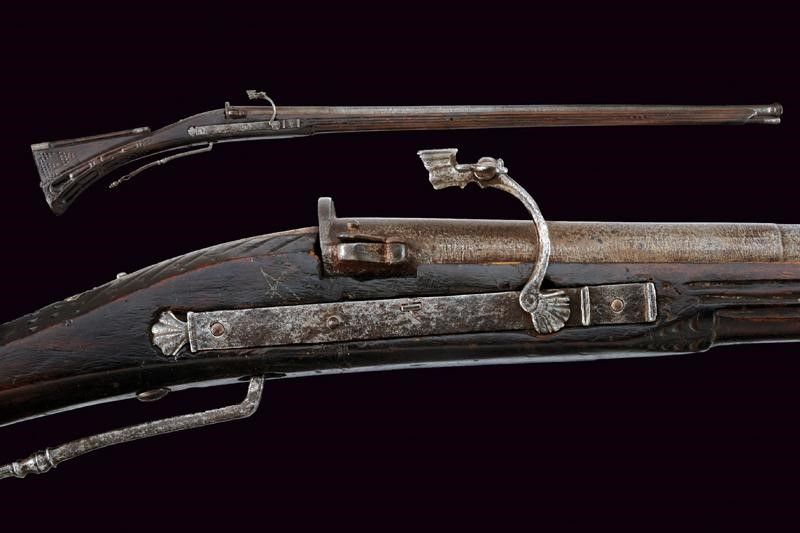 Fine del XVI Secolo Lunga canna liscia in damasco a tre ordini, inizialmente tonda e dotata di alzo alla culatta, poi con un segmento ottagonale, poi ancora tonda e munita di gioia di bocca, in volata cal. 21 mm; sul lato destro lo scodellino, completo del copriscodellino. Lunga codetta con palmetta intagliata. Batteria con cartella rettangolare, la coda e la base del cane con palmetta intagliata. Meccanica funzionante. Cassa intera in legno (alcuni vecchi restauri e piccolissime mancanze), intagliata a scanalature e a motivi geometrici. Fornimenti in ferro, lunga manetta intagliata e recante traforo circolare. Bacchetta in legno con battipalla in ferro.