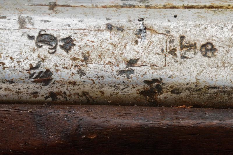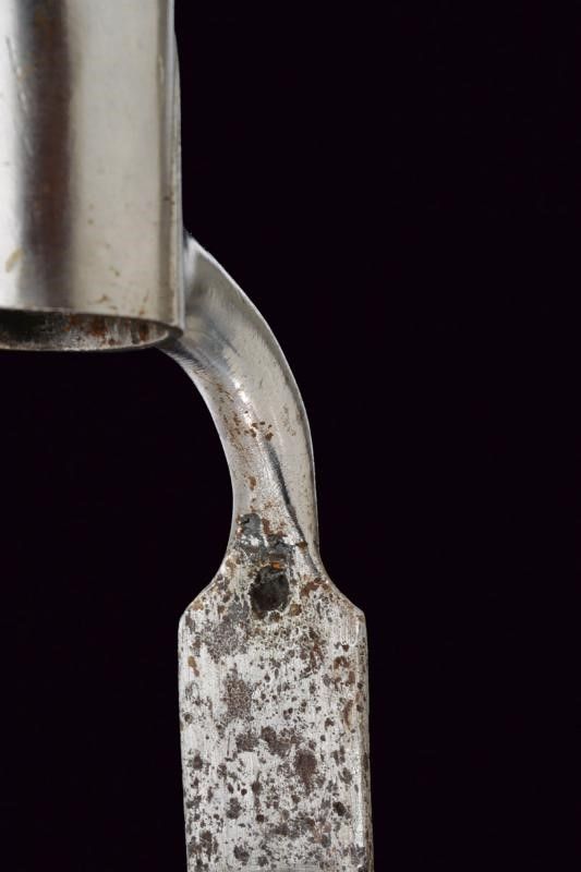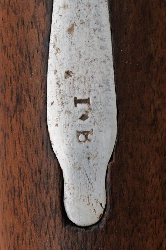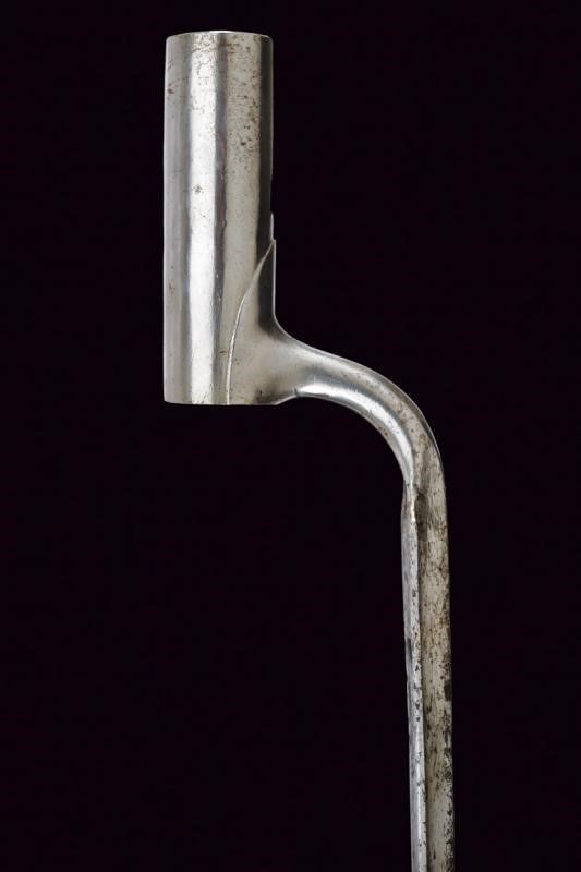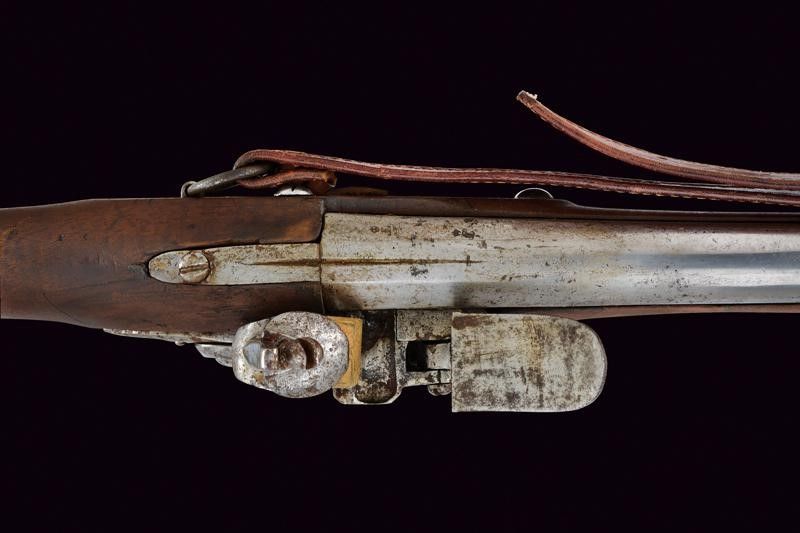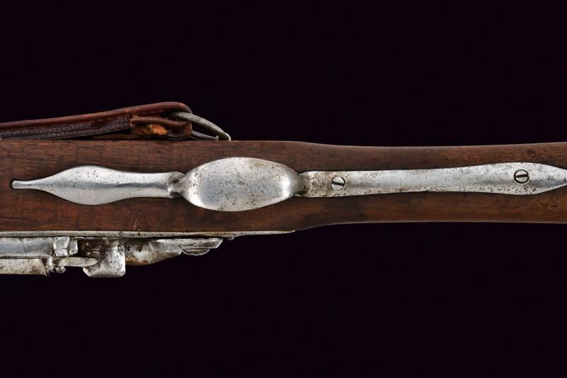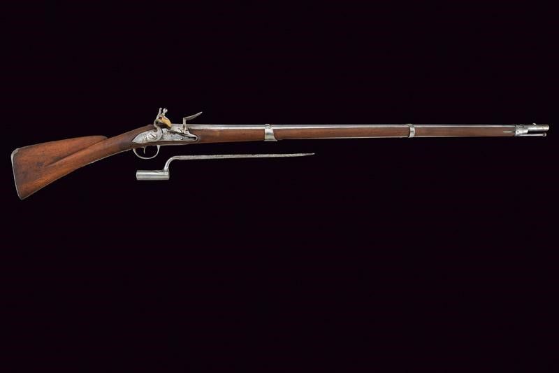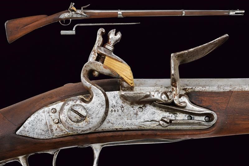 Francia, lunghezza 156 cm. Inizio del XIX Secolo Canna liscia tonda (leggermente accorciata?) con culatta ottagonale, dotata di mirino e di tacca di mira lunga e incavata alla culatta e sul codolo, cal. 18,1 mm. in volata. Batteria con cartella piatta a bordi scantonati, punzonata con V coronata, S*E coronata e marcata JURJON. Meccanica funzionante. Cassa in legno con vari restauri e astina giuntata. La pala con resti di timbro coronato. Fornimenti e bacchetta in ferro. Con una baionetta a manicotto.