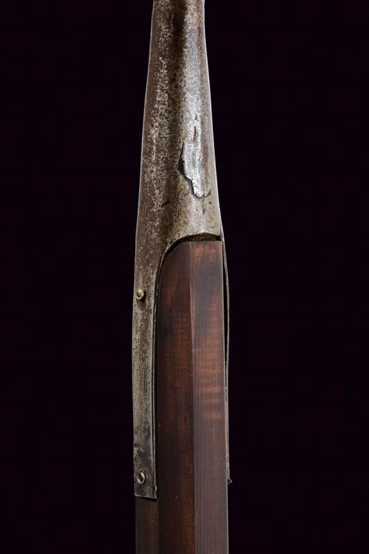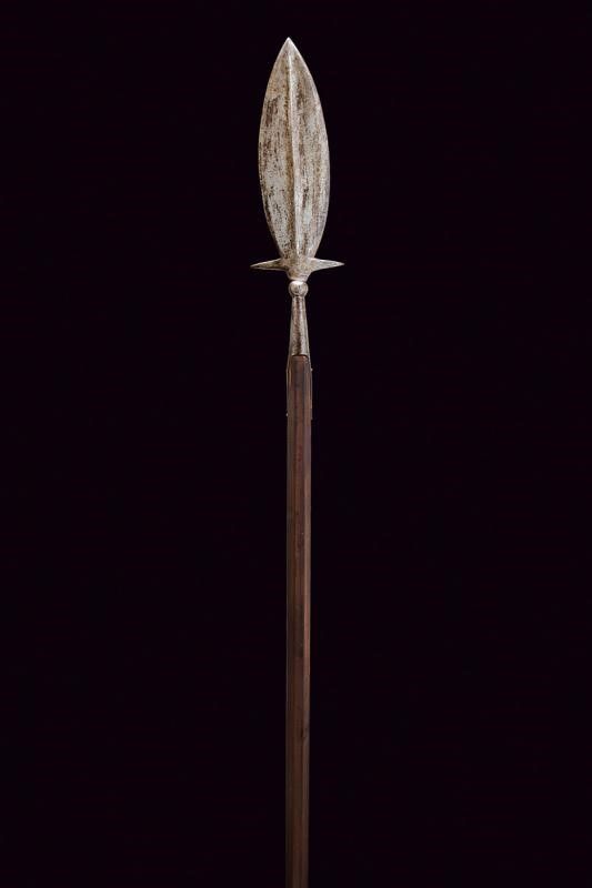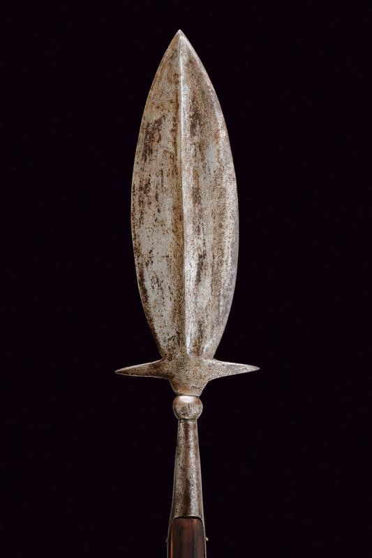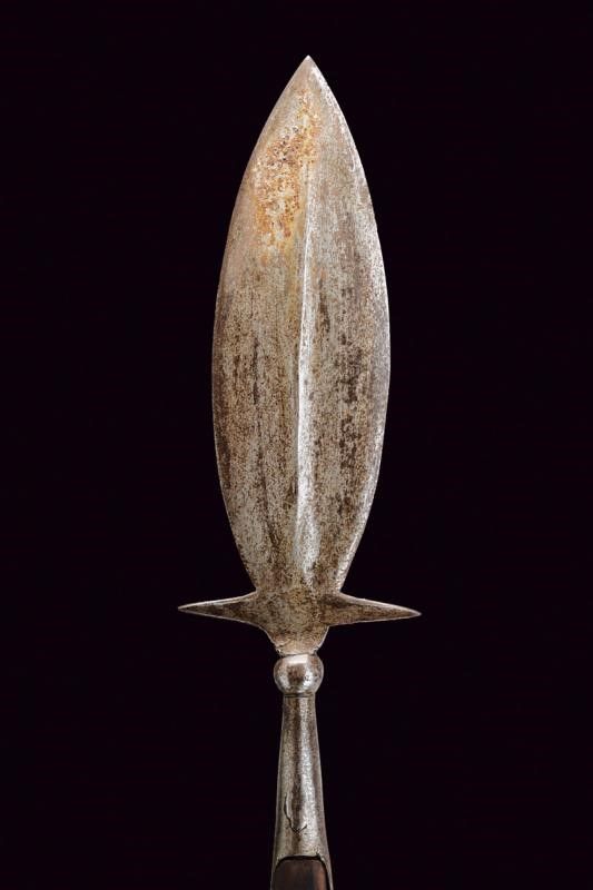 Italia, lunghezza 196 cm. XVII Secolo Grande lama a foglia a due fili costolata in mezzeria, la base con due ali (crepa al centro) posate su una sfera schiacciata e con gorbia troncoconica (piccolo restauro). Con resti di bandelle su fusto faccettato di epoca moderna.
