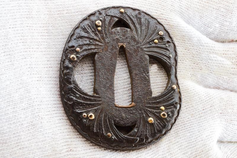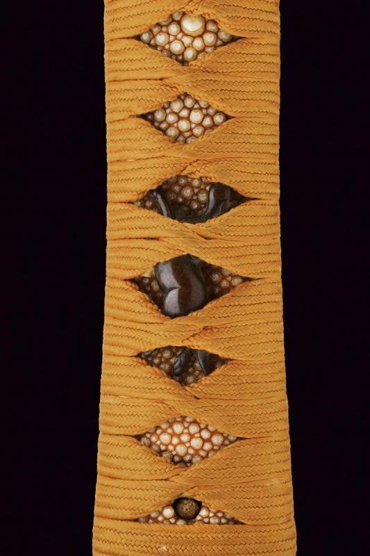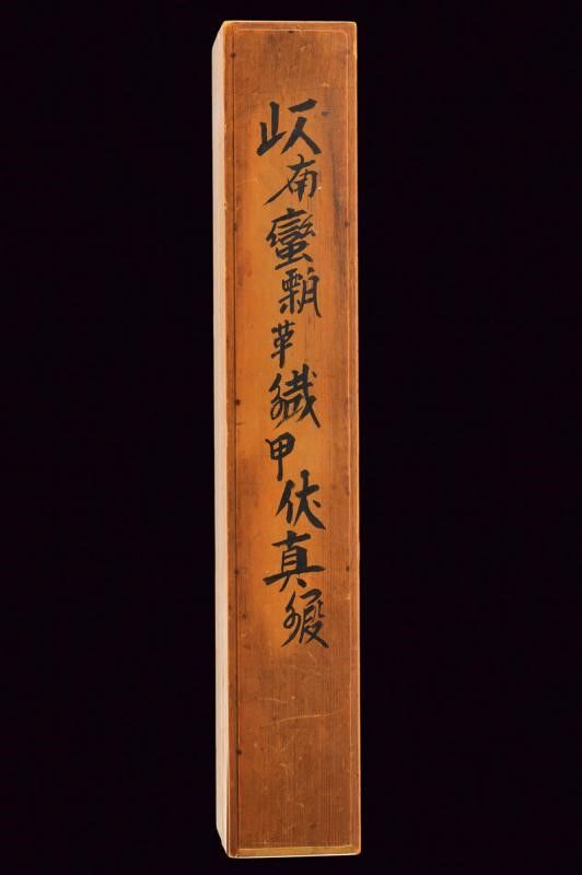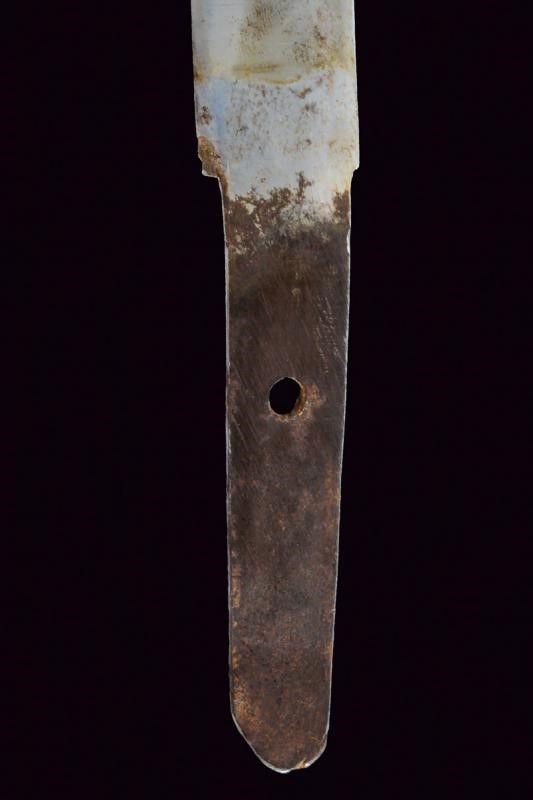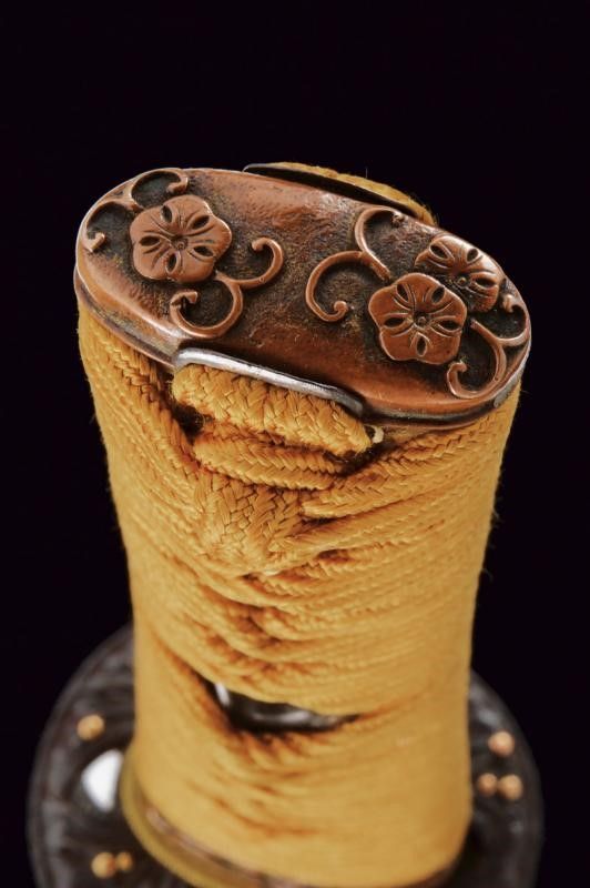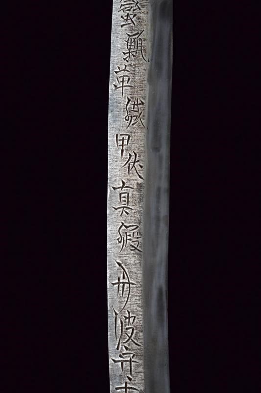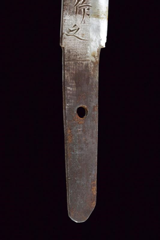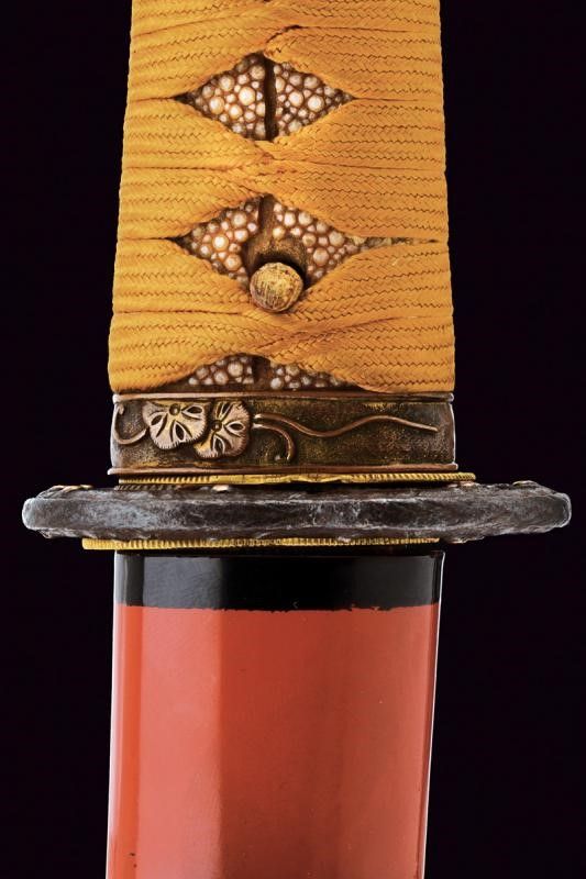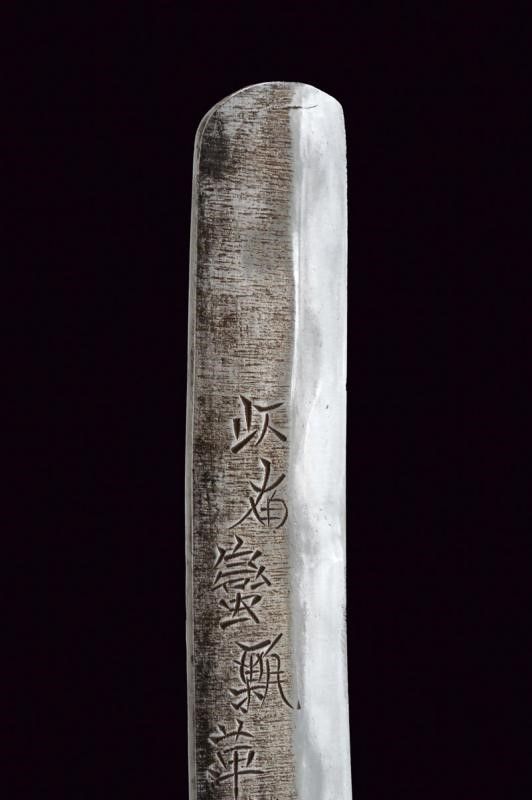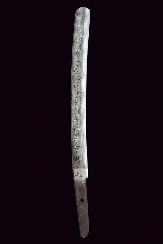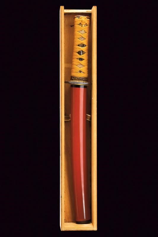 Giappone, lunghezza 41,5 cm. Periodo Edo (1603-1867) Lama a un filo rivolto sul lato incavato, con Mei: Tanba no Kami Yoshimichi saku kore, sulla parte scoperta. Nagasa 25,8 cm. Habaki in rame. In koshirae da Tanto con Tsuba in ferro decorata a foglie ad intaglio e con germogli dorati. Fuchi e Kashira in metallo color rame con fiori in rilievo. Menuki effigianti cavalli. Tsuka-ito forse più tarda in seta color senape. Saya in lacca rossa. Nella sua vecchia custodia in legno (una mancanza su un lato) con iscrizione. Probabilmente da giardiniere.