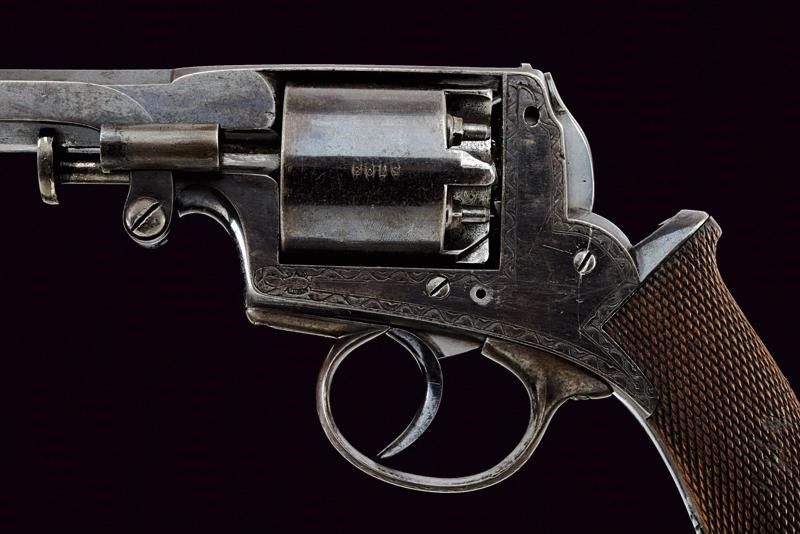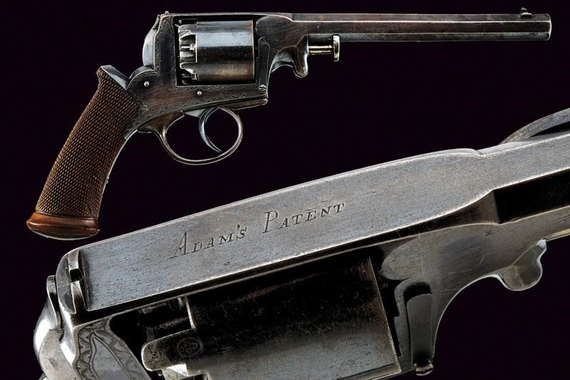 1851 Canna ottagonale rigata (anima pulita, rigatura ben visibile), con incisione del brevetto ADAM'S PATENT, munita di mirino e traguardo, in calibro 12 mm. Tamburo a cinque colpi con punzone del banco di prova di Liegi, punzone M sotto corona e con numero di matricola 57xx. Castello con bordi incisi a motivi geometrici, timbro del brevetto e data ADAMS 1851 PATENT, punzone M e numero di matricola coevo, sul fianco sinistro il calcatoio. Ponticello e coccia incisi en suite, quest'ultima dotata di porta capsule. Tutta la superficie presenta ancora resti di brunitura antica. La molla esterna sul lato sinistro mancante. Impugnatura in legno zigrinato. Meccanica funzionante in singola azione.