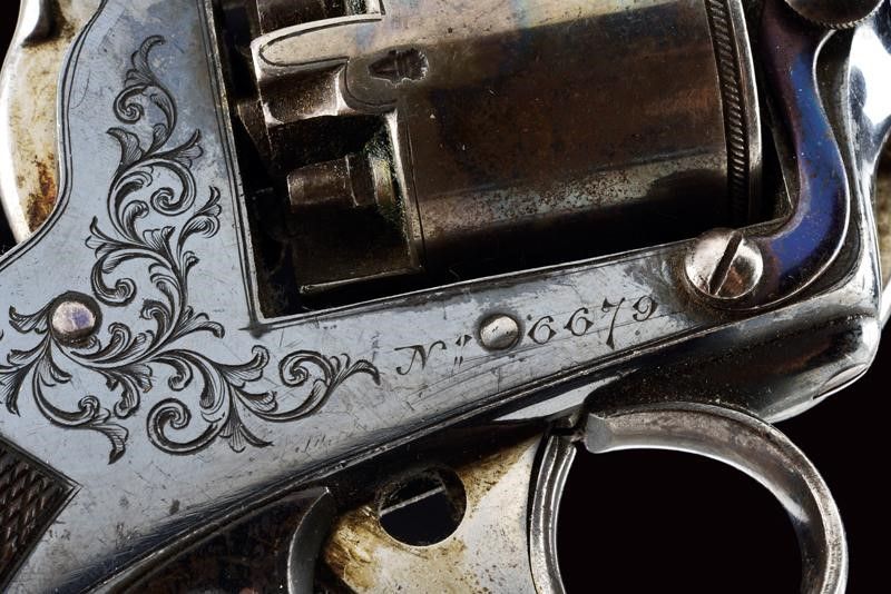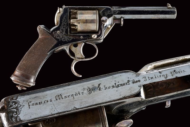 Francia, lunghezza 24 cm. 1850/60 Canna di sezione ottagonale, rigata (rigatura visibile, anima da pulire), dotata di mirino, cal. 9 mm. Dorso con marcatura Francis Marquis B.te 4 Boulevard des Italiens Paris. Incisioni a racemi. Brunitura antica presente al 70%. Tamburo a sei colpi con resti di tartarugatura, recante punzoni del banco di Londra. Impugnatura in legno zigrinato. Estrattore e grilletto con diciture dei brevetti Tranter. Meccanica funzionante.