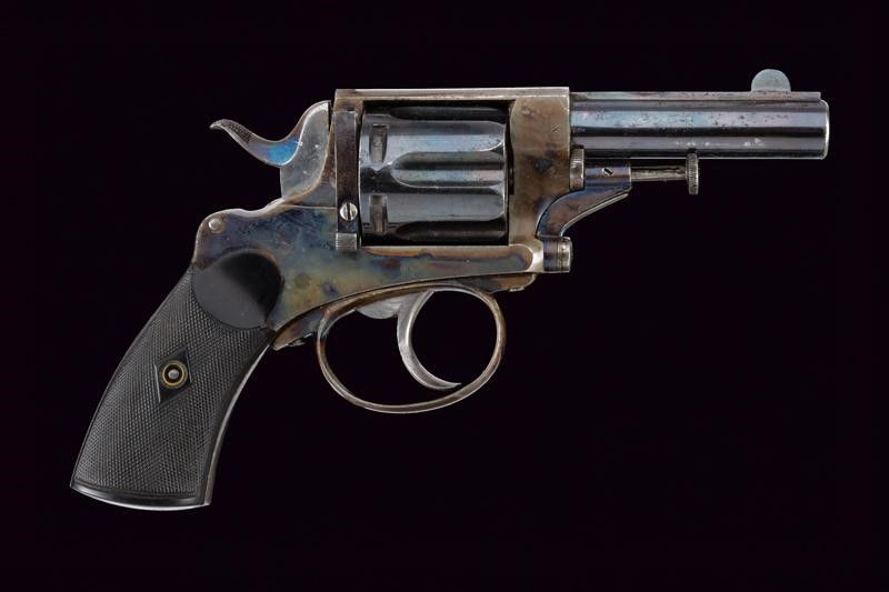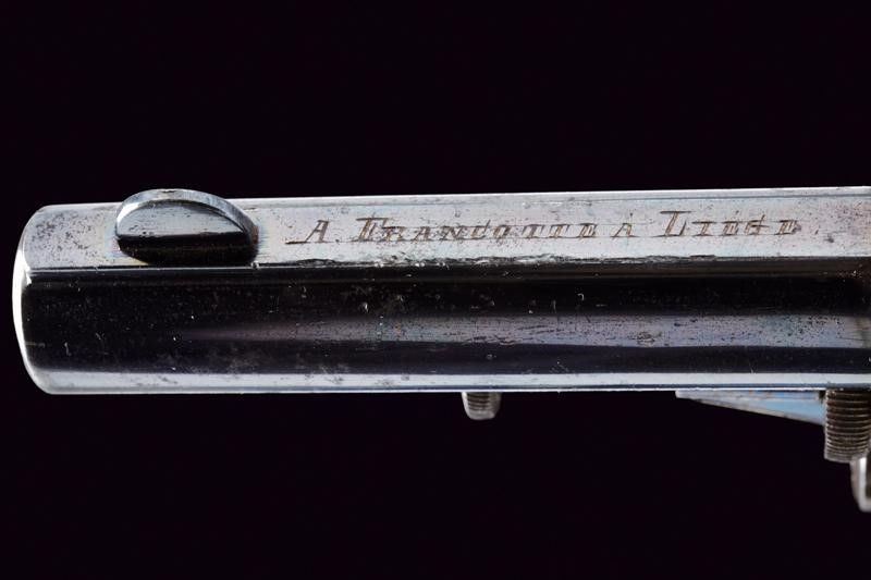 Belgio, lunghezza 18,2 cm. 1880 circa Canna tonda rigata (rigatura visibile, anima pulita) dotata di bindella con marcatura A. FRANCOTTE A LIEGE. Tamburo a sei colpi con puznone del banco di Liegi senza corona. Castello con resti di tartarugatura probabilmente antica, marcato con dicitura del calibro 380, matricola, monogramma su ancora e DEPOSE. Guancette in ebano zigrinato. Meccanica ben funzionante in singola e doppia azione. Canna e tamburo conservano il 70% della brunitura antica.