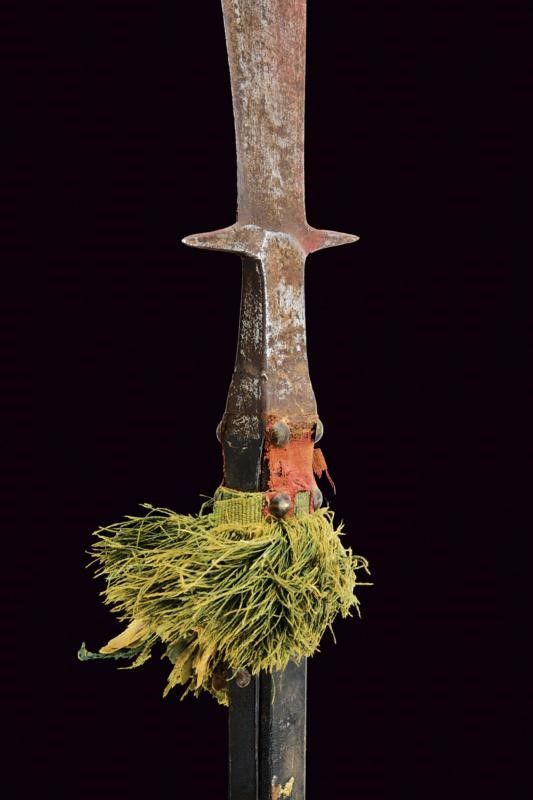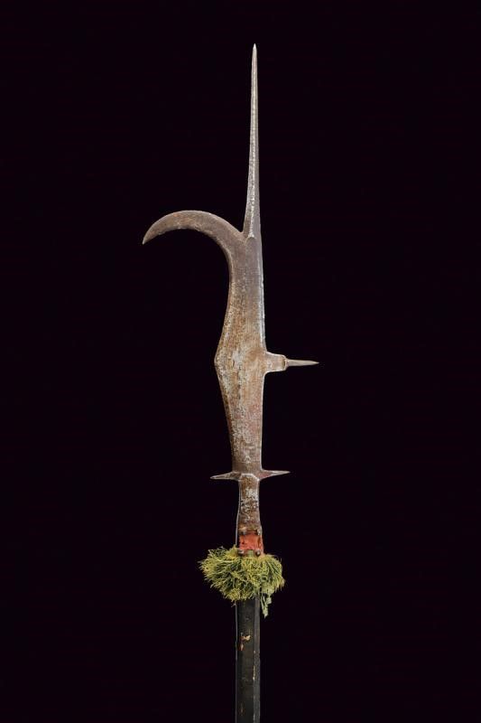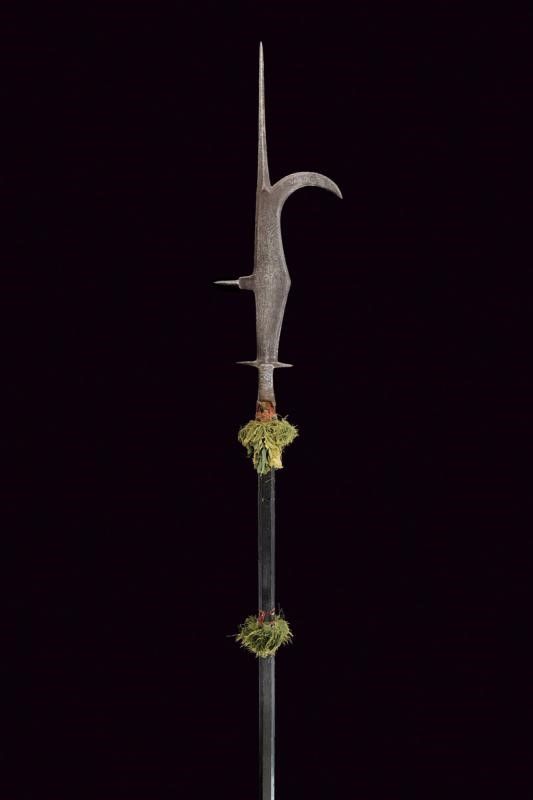 Italia del Nord, altezza 258,5 cm. Prima metà del XVI Secolo Ferro con cuspide sommitale a sezione di losanga fortemente rastremata verso l'alto, ronca lunata affilata, arresto dorsale con base quadra e spessa cuspide a quadrello, gli arresti alla base perpendicolari al piano di lama. Gorbia con vecchia riparazione e brevi bandelle. Su asta lignea ottagonale probabilmente d'inizio XX secolo, munita di due nappine decorative color verde.