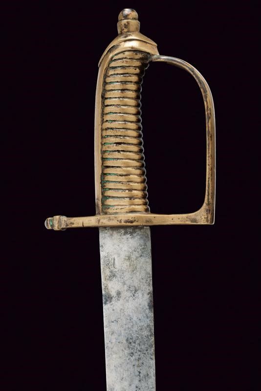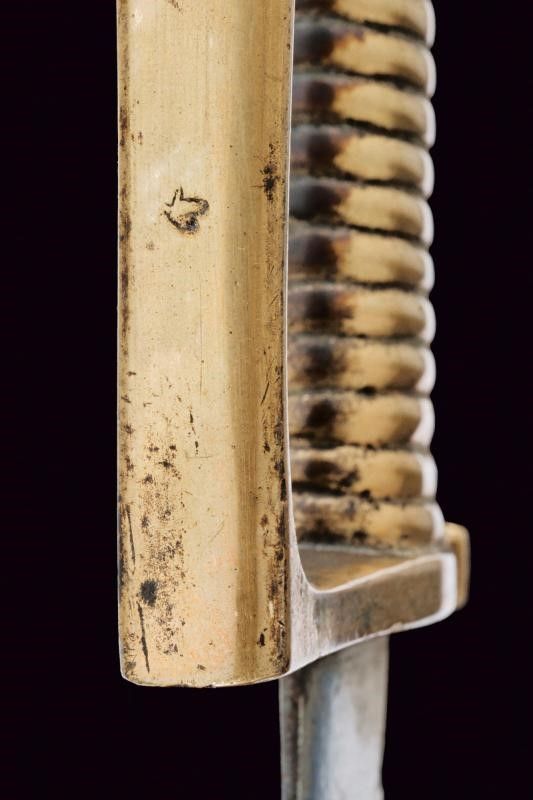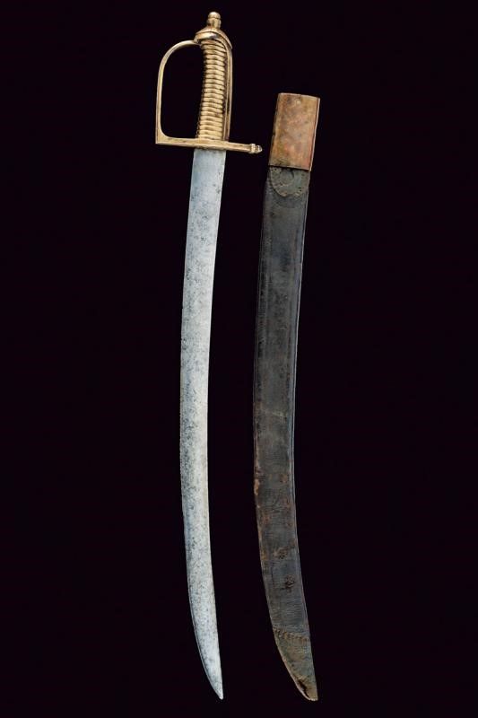 Francia, lunghezza 73,5 cm. Fine XVIII inizio XIX Secolo Lama curva a un filo e breve controfilo, di sezione triangolare a facce piane, recante resti di un punzone a fascio littorio sormontato da berretto frigio. Il fornimento in un unico pezzo con l'impugnatura, in ottone, sul dorso del braccio di parata resti di marcatura LVP... Fodero in cuoio antico (forti segni d'uso e del tempo) mancante di puntale, la cappa in metallo color rame dotata di bottoncino.