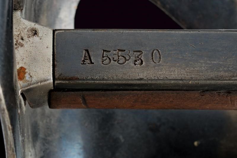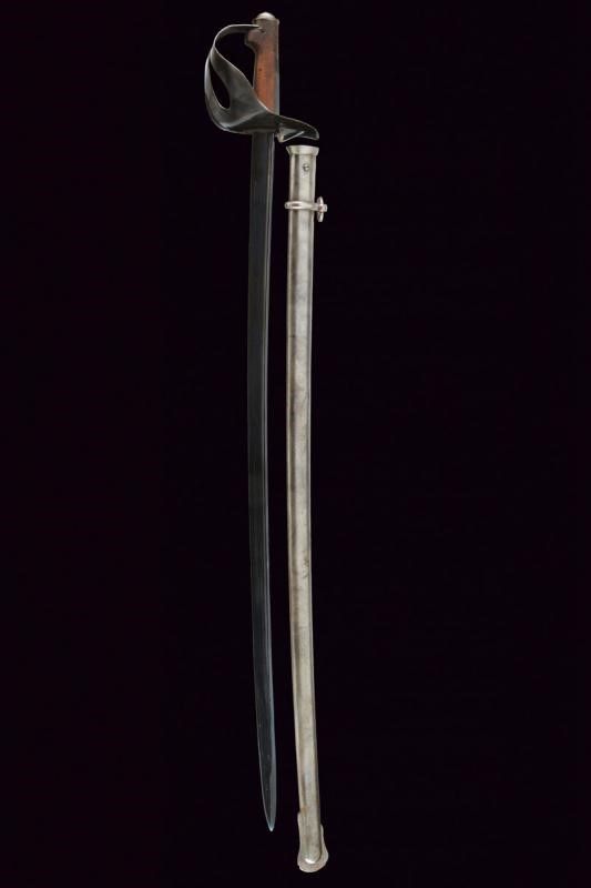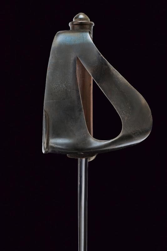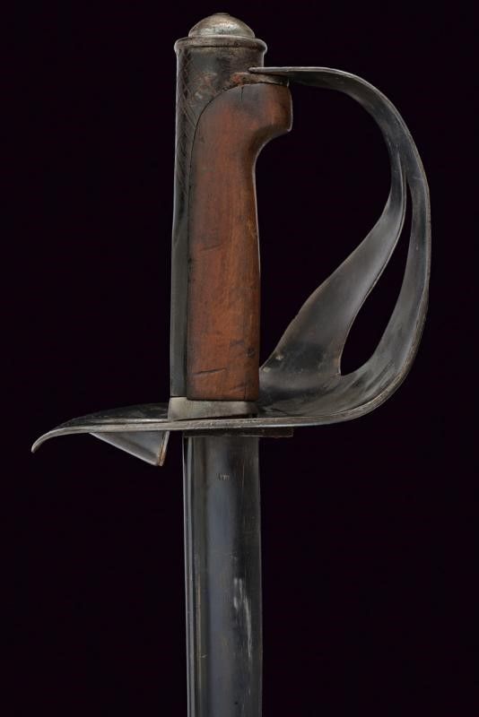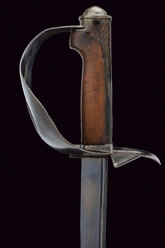 Regno d'Italia, lunghezza 106.5 cm. Fine del XIX Secolo Lama brunita leggermente curva a un filo e controfilo con dorso a bacchetta, la base punzonata sul lato di quarta MA. Fornimento in ferro marcato due volte 26, anch'esso brunito, grossa vela con singolo traforo a goccia. Impugnatura in legno (alcune mancanze) con cappetta lunga, la parte vicino al pomo intagliata a righe oblique che si intersecano e marcata A 5530 nelle vicinanze del massello. Completa di fodero in ferro (danni) ad un anello di sospensione.