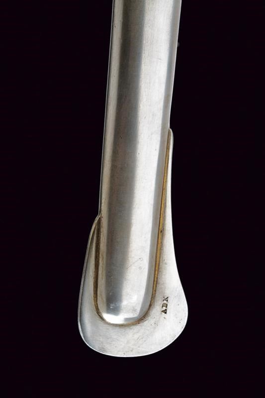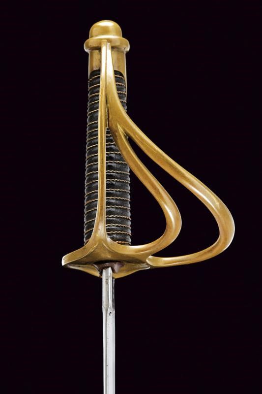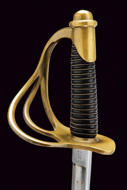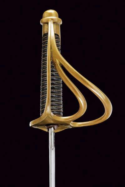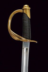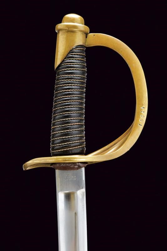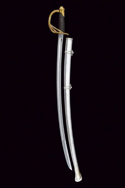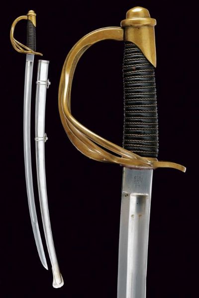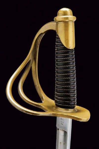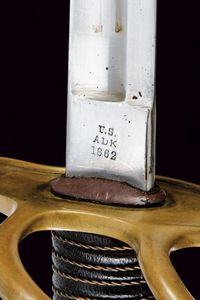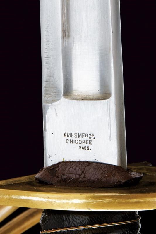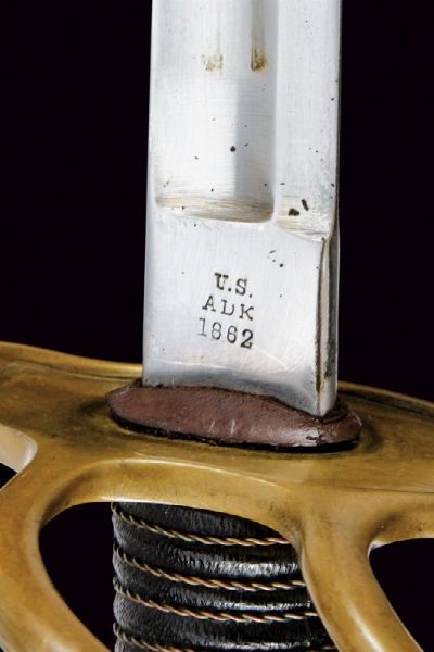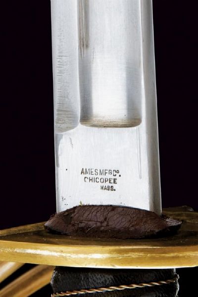 USA, lunghezza 101.5 cm. XX Sec. Lunga lama curva a un filo e controfilo, con sgusciatura centrale e scanalatura dorsale, il tallone marcato sul lato terzo U.S / ADK / 1862 e su quello di quarta AMES MFGC° / CHICOPEE / MASS.. Fornimento con guardia a tre rami in ottone, con marcatura 11501 su quello principale. Impugnatura rivestita di cuoio con trecciola in rame. Completa del fodero in ferro, due anelli di sospensione.